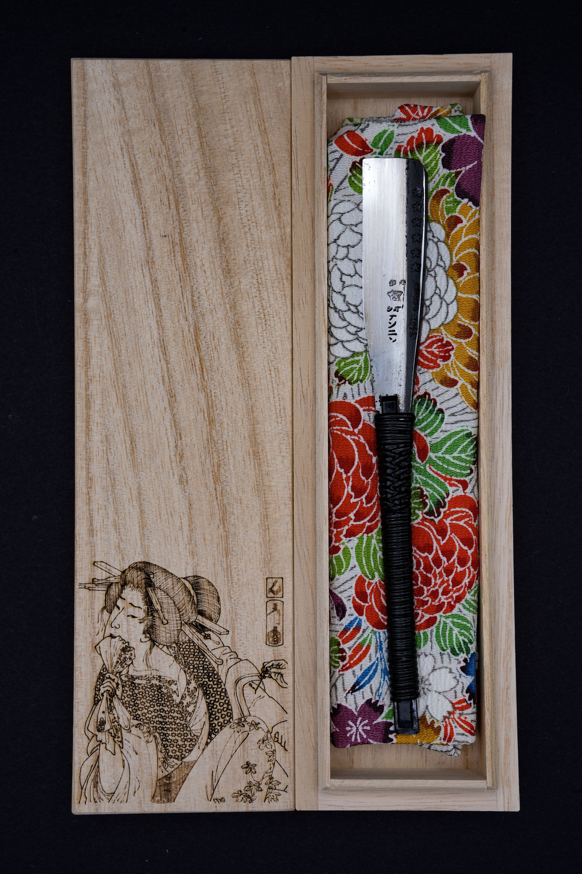 Auf dem Deckel ist ein Ukiyo-e-Holzschnitt von Tsukioka Yoshitoshis „Schmerz leidend - Kurtisane des Zeitalters“ aus der Serie „32 weibliche Gesichter des alltäglichen Lebens“ von 1888 eingraviert. Der Druck zeigt eine Geisha mit dem höchsten Rang „Oiran“ die sich tätowieren lässt. Es war durchaus üblich, dass sich Geishas die Namen ihrer wertvollsten Kunden heimlich tätowieren ließen.