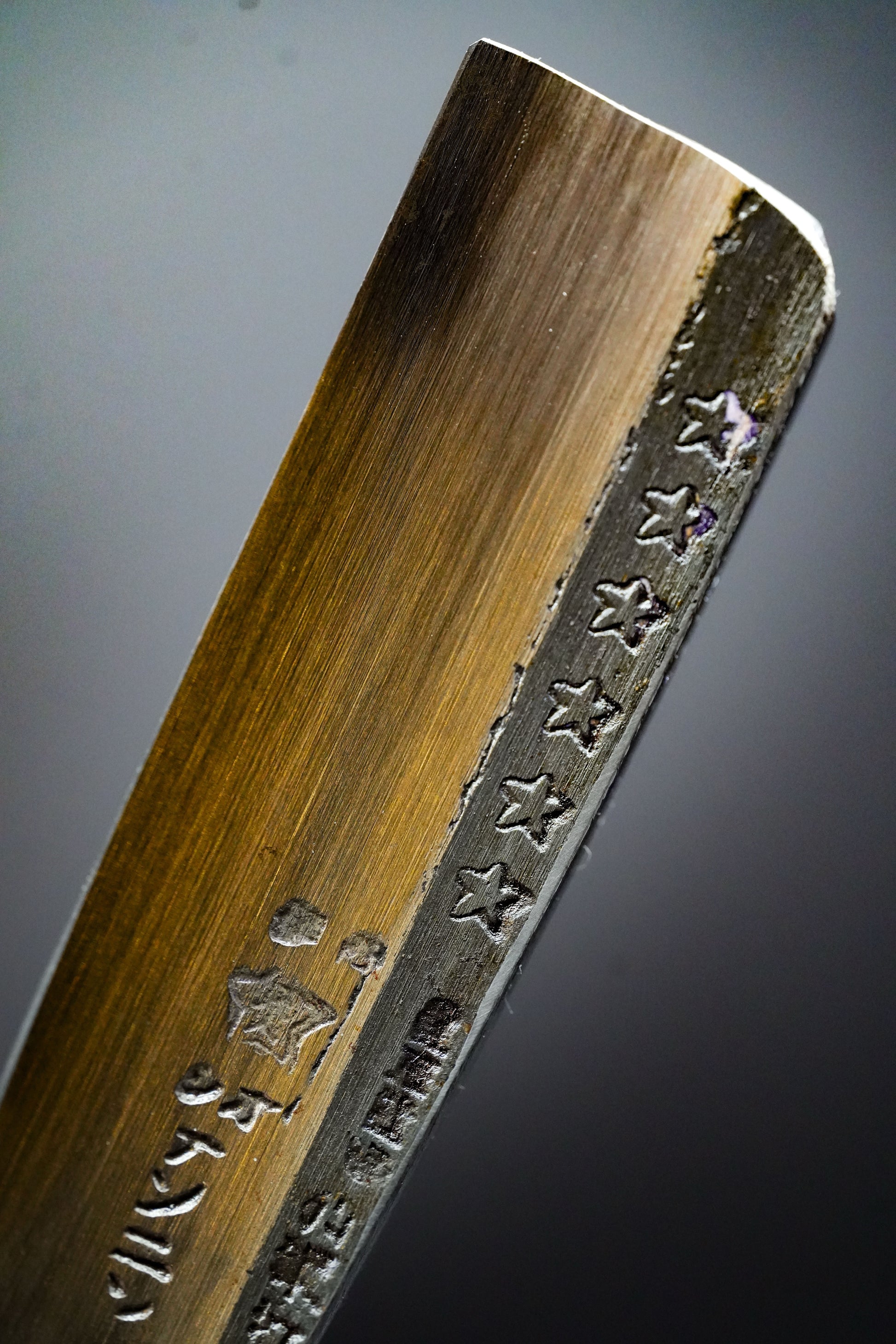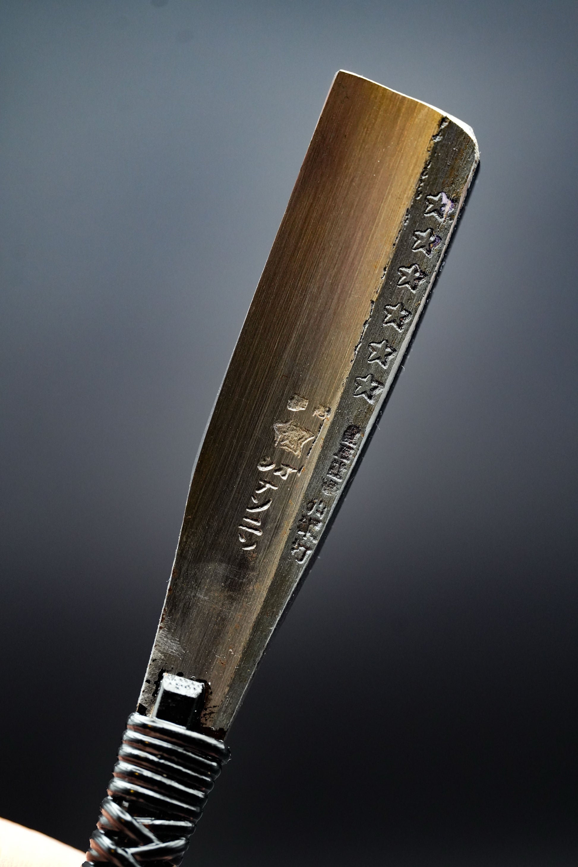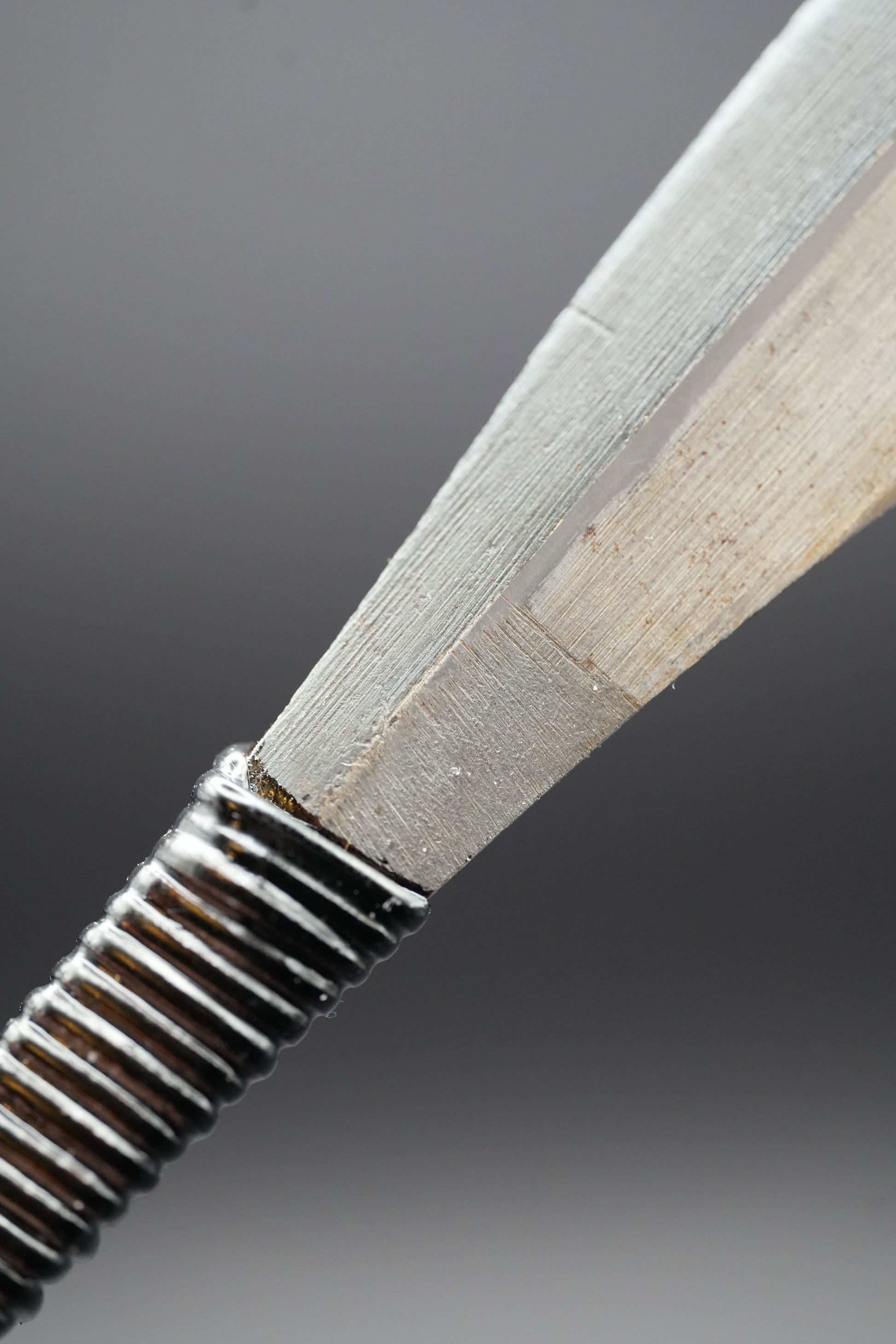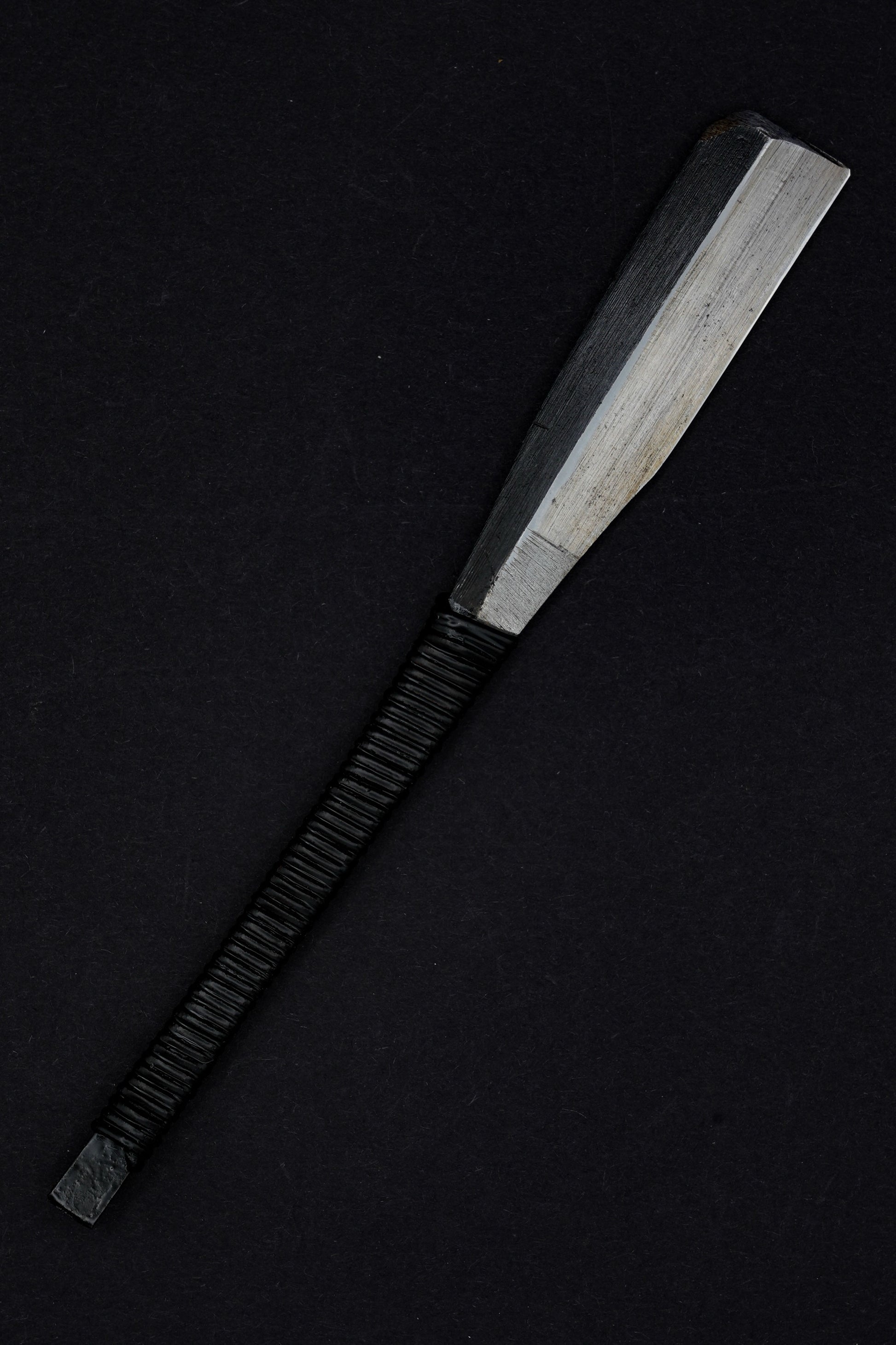 Wir haben den alten Griff sowie alte Flecken und Rost entfernt. Anschließend haben wir ihn gebläut, um weiteres Rosten zu verhindern. Anschließend haben wir eine traditionelle Rattan-Griffumwicklung mit natürlichem japanischem Urushi-Lack angebracht.