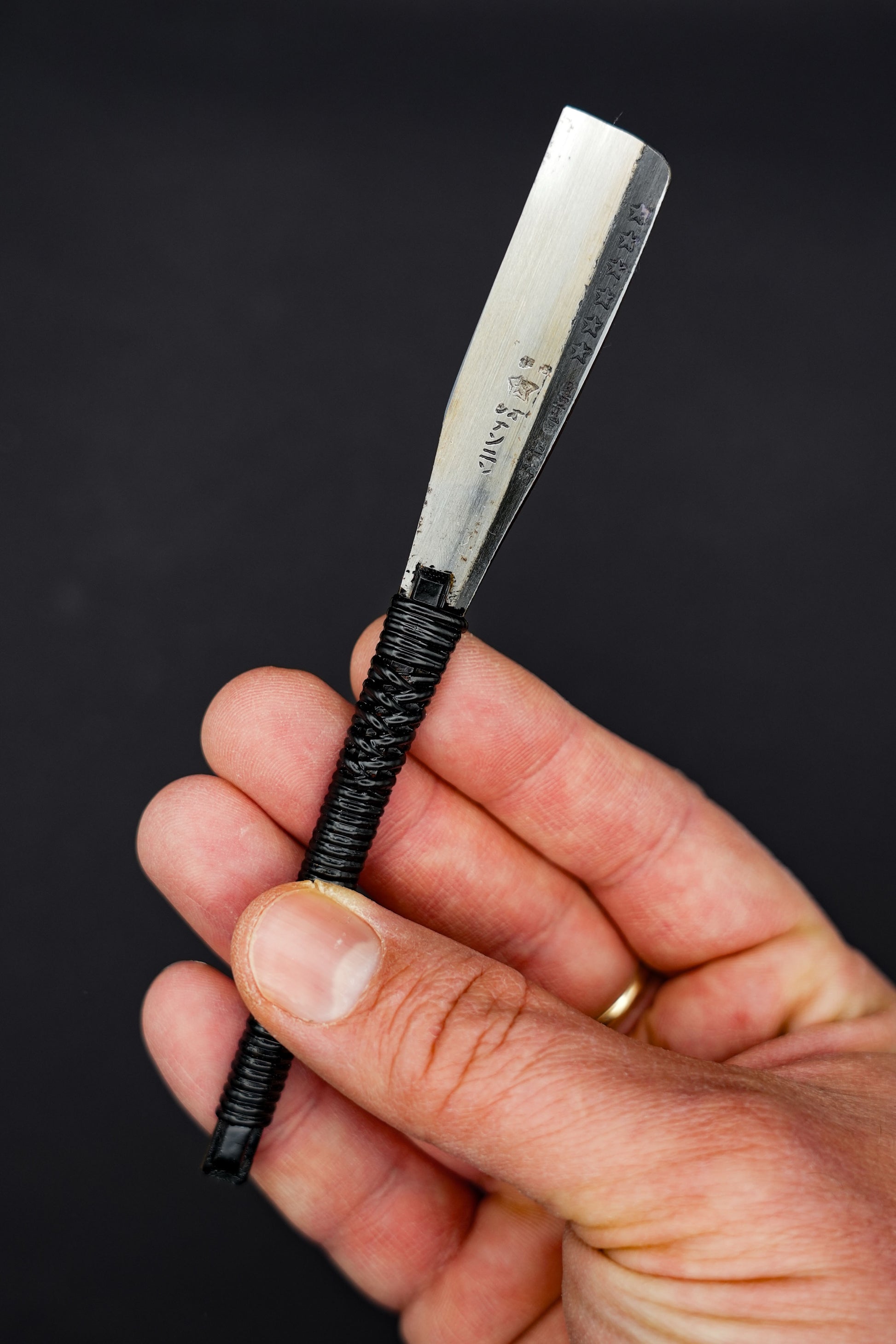 Kohlenstoffhaltige Stähle, wie die Schneidschicht dieses Kamisori, haben eine viel höhere Härte und behalten ihre glatte Rasierqualität viel länger, bevor sie erneut geschärft werden müssen.