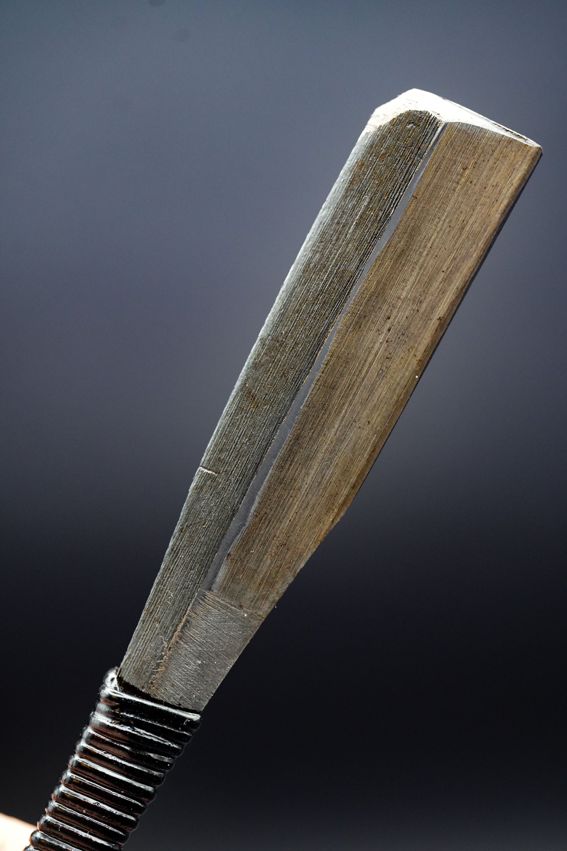 Ähnlich wie das traditionelle Samurai-Schwert wurde dieses Kamisori aus zwei Schichten handgeschmiedet, wobei der Schneidteil aus Kohlenstoffstahl und die Stützschicht aus Eisen besteht.