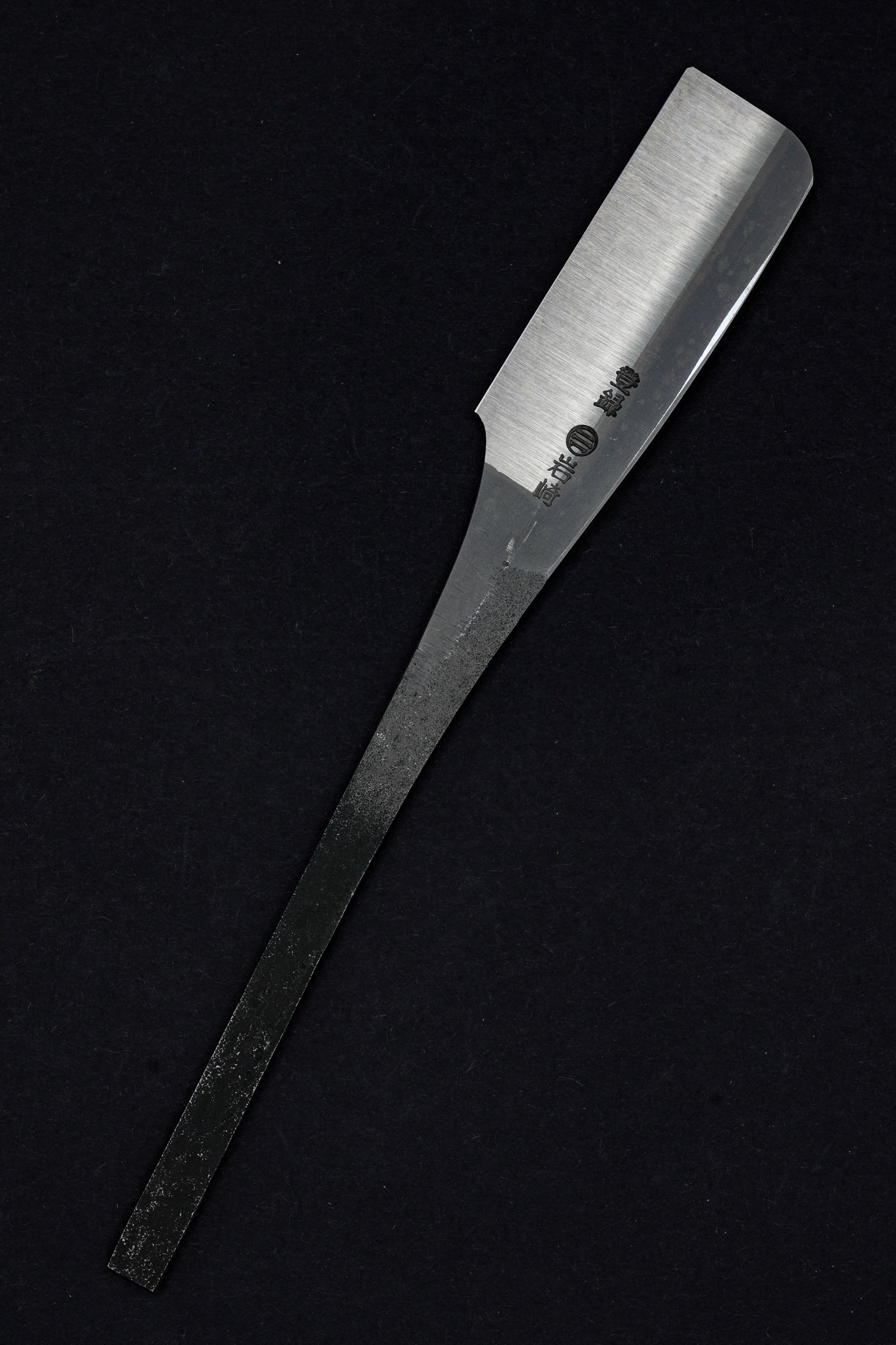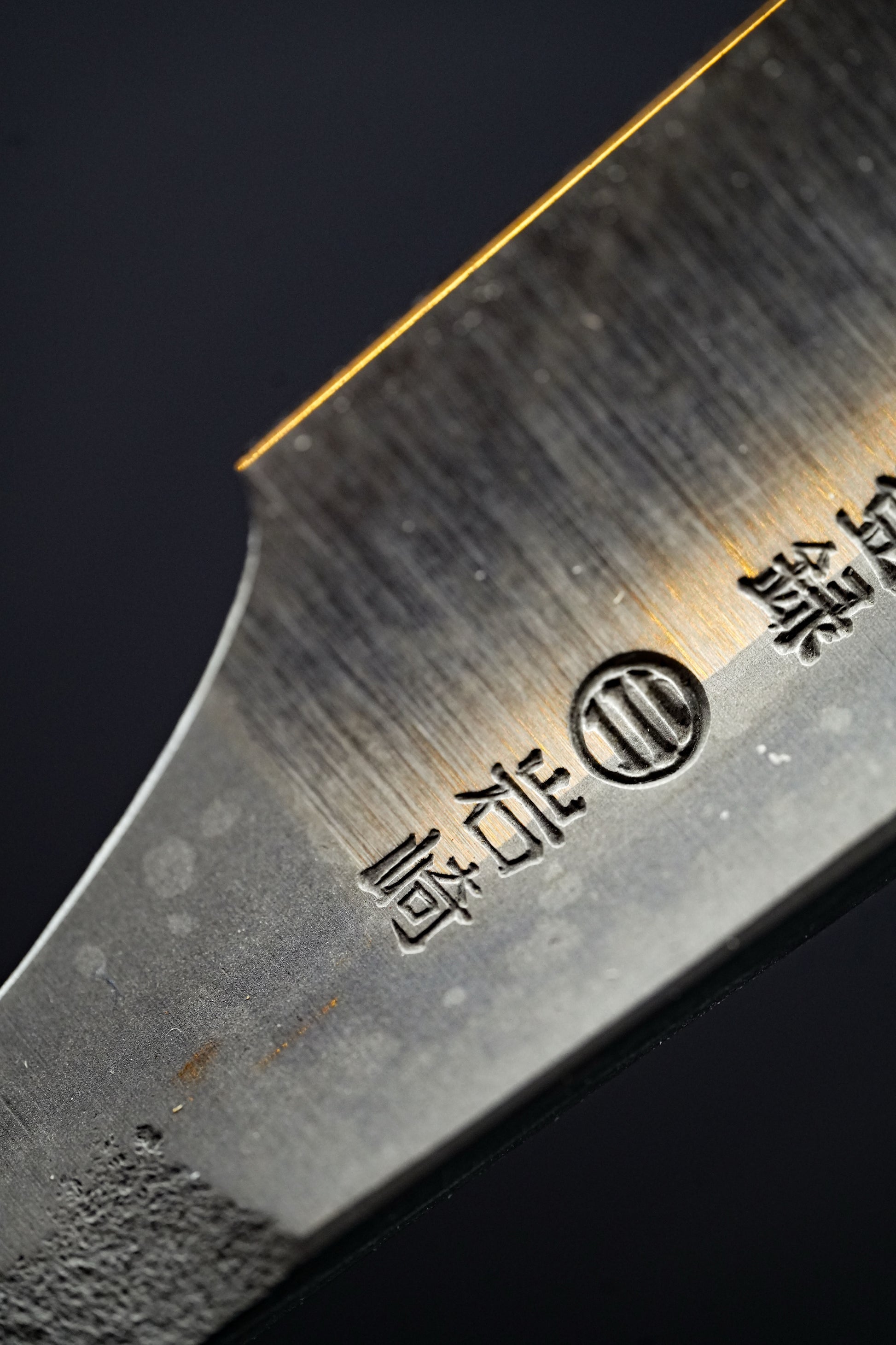 Komplett mit Originalverpackung. Der Kopf ist einseitig ohne Schmiedehaut, dies verrät, dass es vermutlich von Shigeyoshi Iwasaki gefertigt wurde, bevor Mizuochi die Werkstatt in Sanjo vollständig übernahm. Shigeyoshi sandstrahlte die Köpfe seiner Kamisoris vor dem Verkauf.
