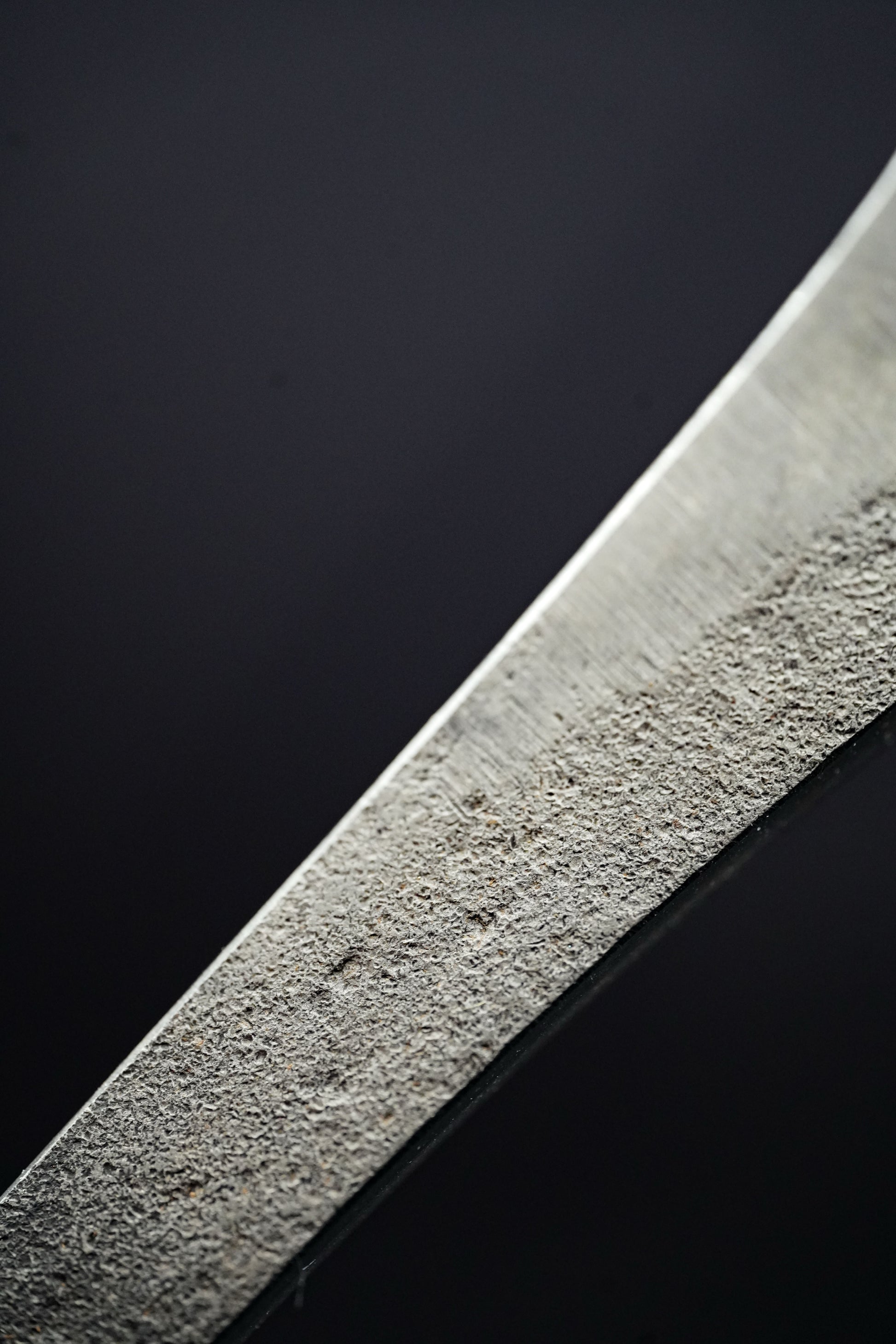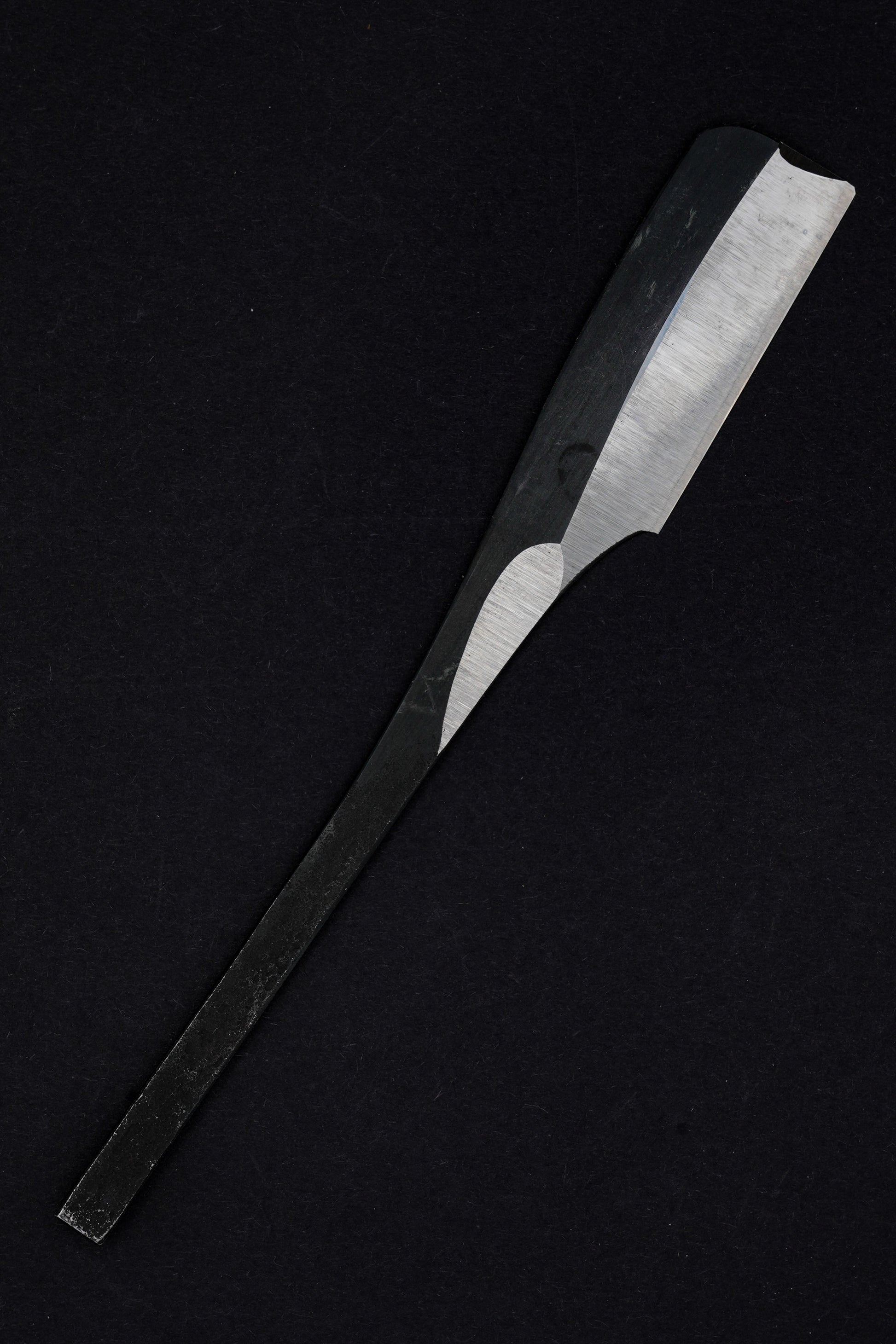 Ähnlich wie das traditionelle Samurai-Schwert wurde dieses Kamisori aus zwei Schichten handgeschmiedet: Der Schneideteil besteht aus Kohlenstoffstahl, die Stützschicht aus Eisen.