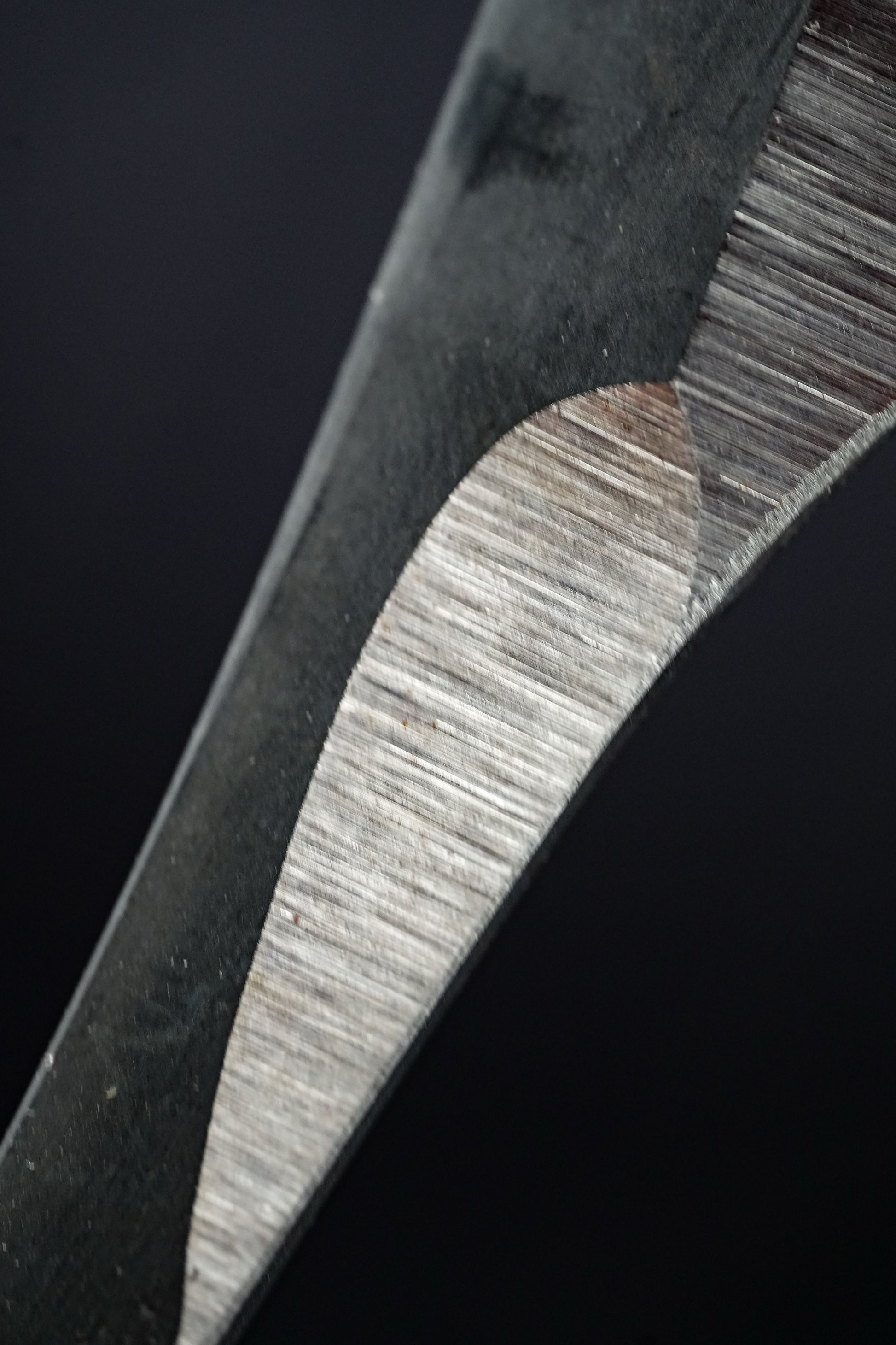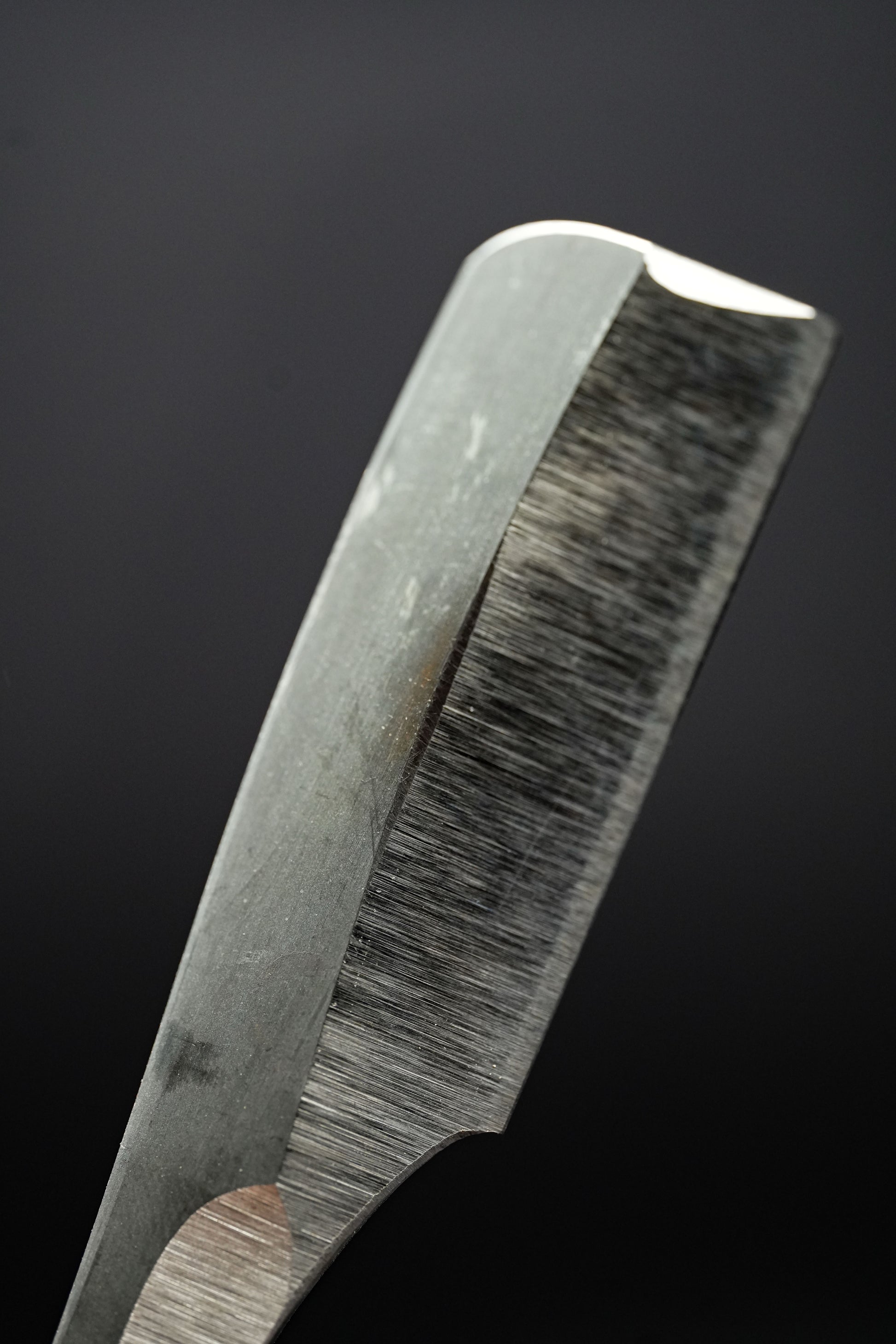 Hochkohlenstoffstähle, wie die Schneideschicht dieses Kamisori, weisen eine deutlich höhere Härte auf und behalten ihre glatte Rasierqualität viel länger, bevor sie erneut geschärft werden müssen.