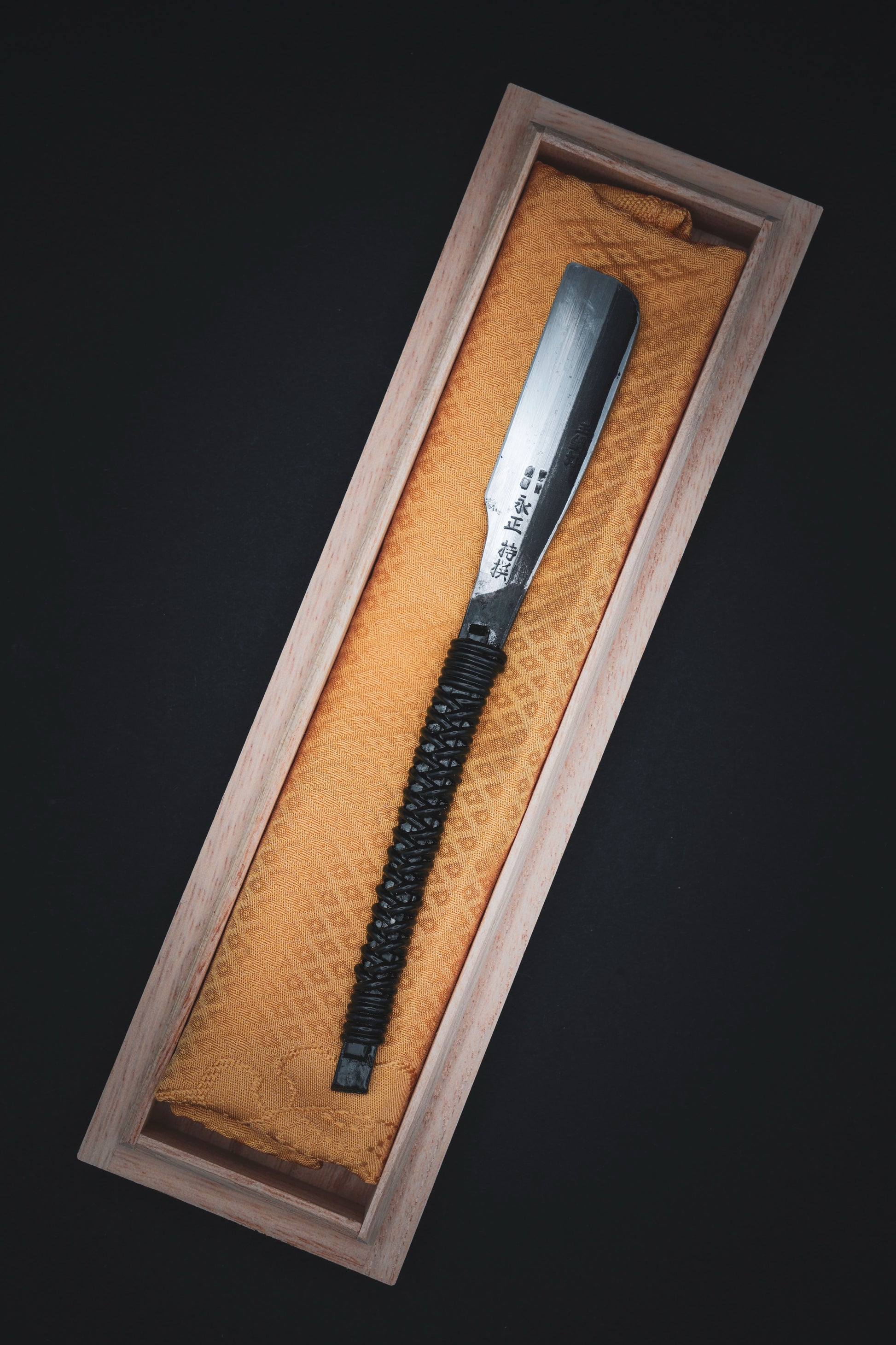 Die Klinge ist in ein wiederverwertetes Vintage-Stück eines japanischen Seidenkimonos eingewickelt.