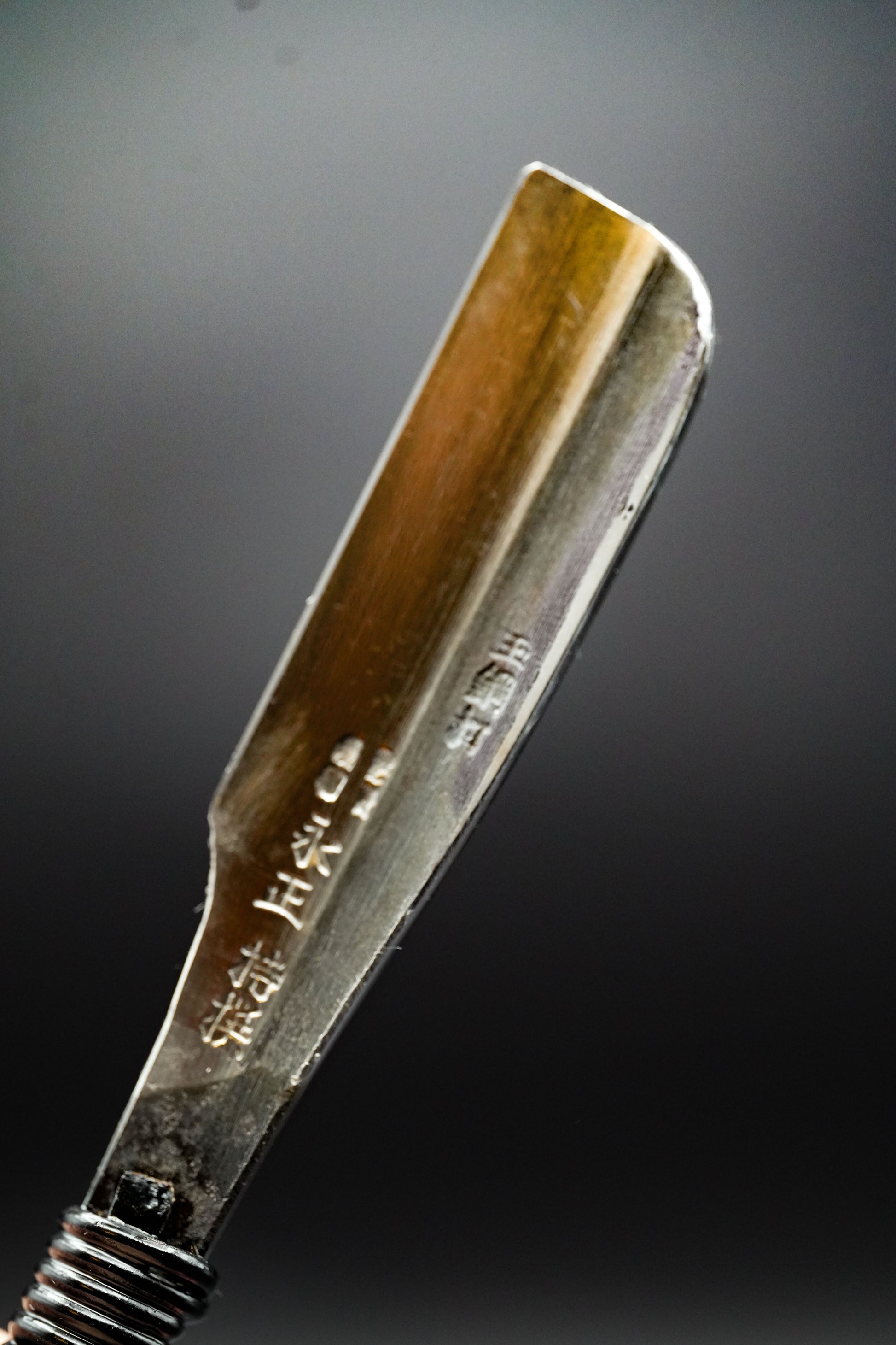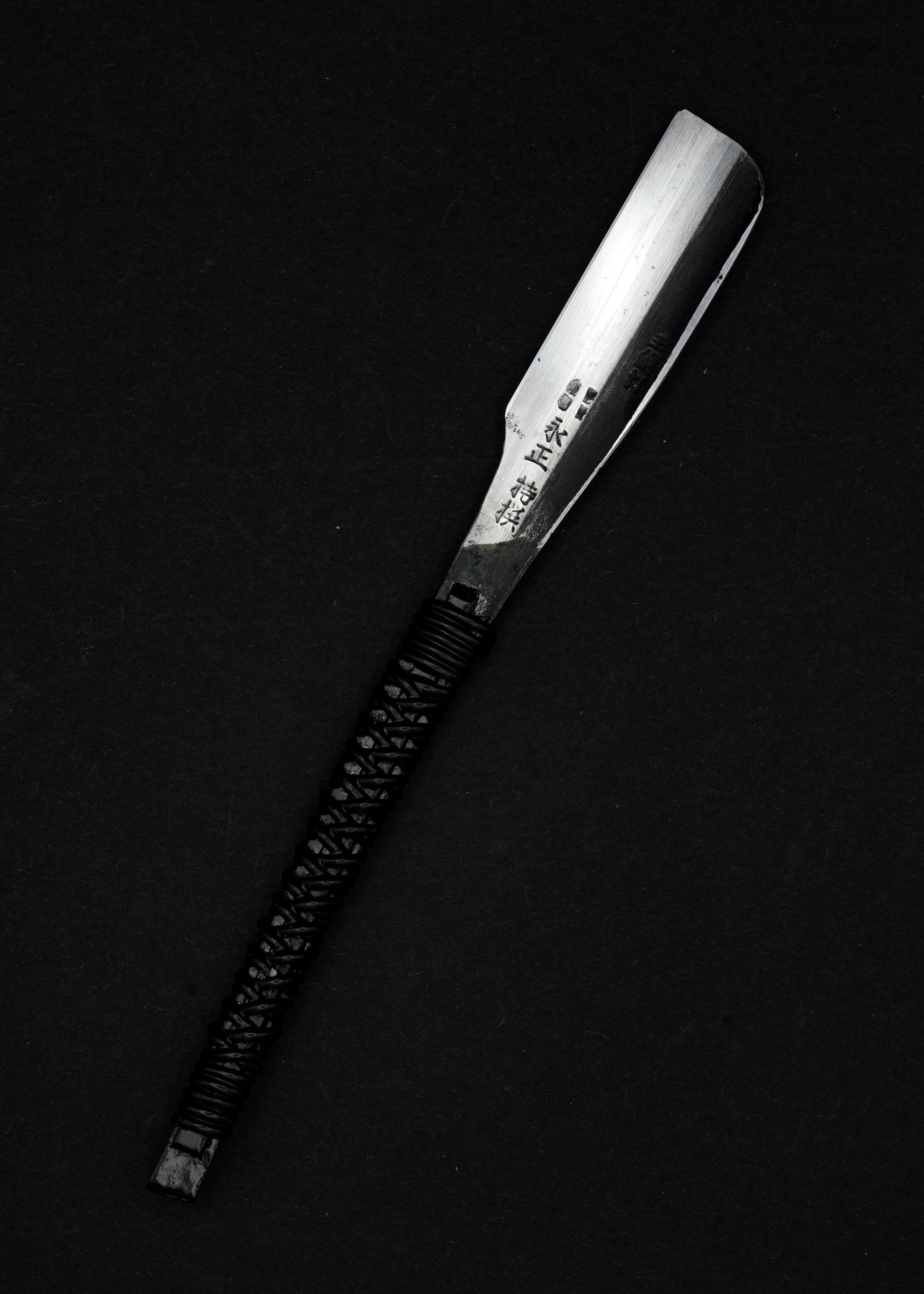 Ähnlich wie das traditionelle Samurai-Schwert wurde dieses Kamisori aus zwei Schichten handgeschmiedet, wobei der Schneidteil aus Kohlenstoffstahl und die Stützschicht aus Eisen besteht.