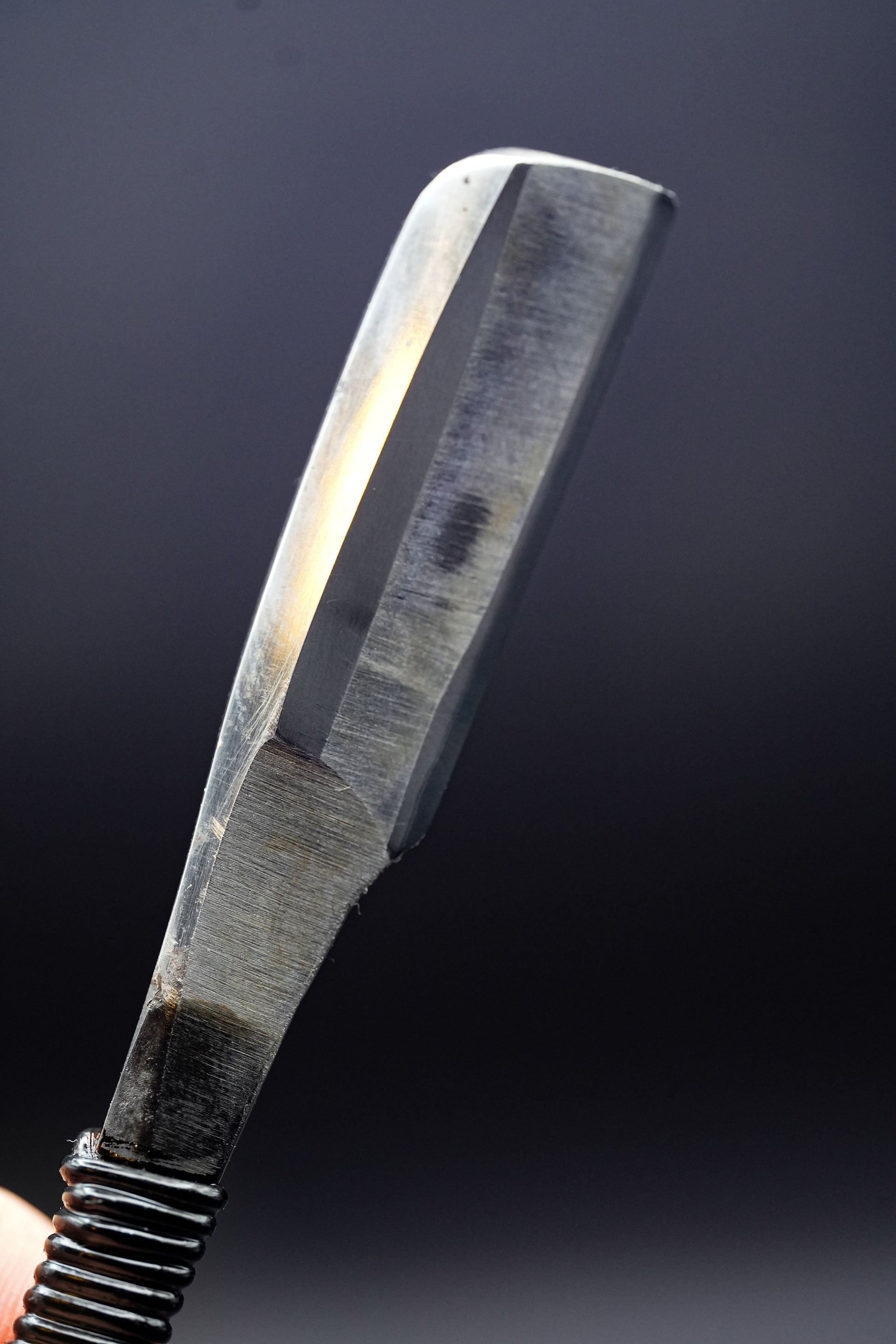 Kohlenstoffhaltige Stähle, wie die Schneidschicht dieses Kamisori, haben eine viel höhere Härte und behalten ihre glatte Rasierqualität viel länger, bevor sie erneut geschärft werden müssen.