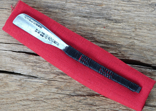 Kamisoris are made of two layers of metal. Usually a soft Iron or soft steel which does not harden when quenched is the layer which forms the handle and the Omote side of the Kamisoris. Out of necessity a small layer of High Carbon steel is hammer welded on the soft layer. This High Carbon steel hardens when heated and quenched and forms the cutting part of the Kamisori. The High Carbon Steel can be from many Sources and sometimes it is made of very rare Tamahagane (玉鋼)