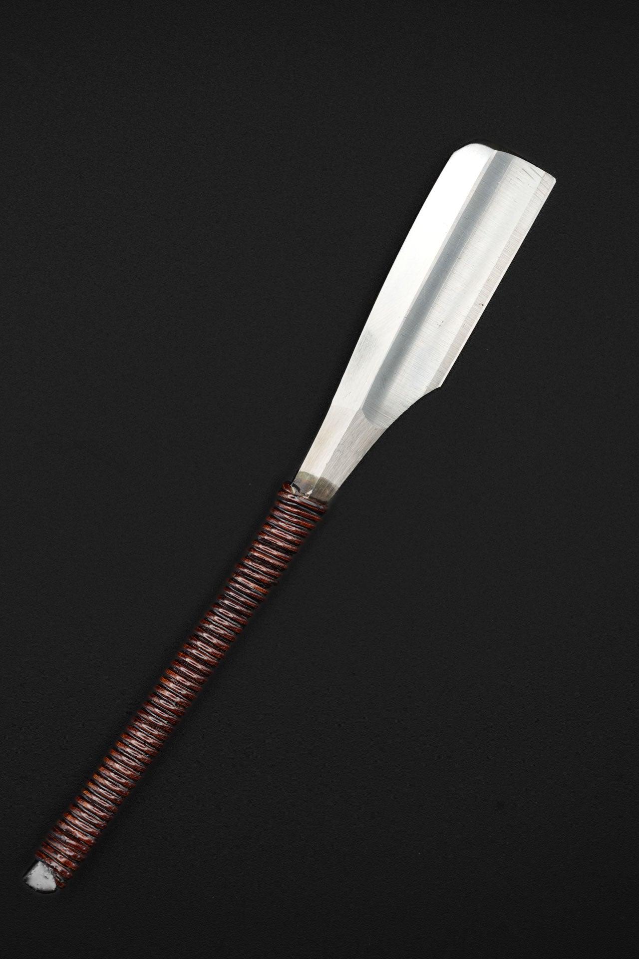 Nous avons retiré l'ancienne poignée et les anciennes taches, puis nous l'avons bleuie pour la protéger de la rouille. Enfin, nous avons fixé une poignée traditionnelle en rotin recouverte de laque urushi japonaise naturelle.