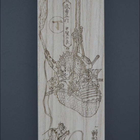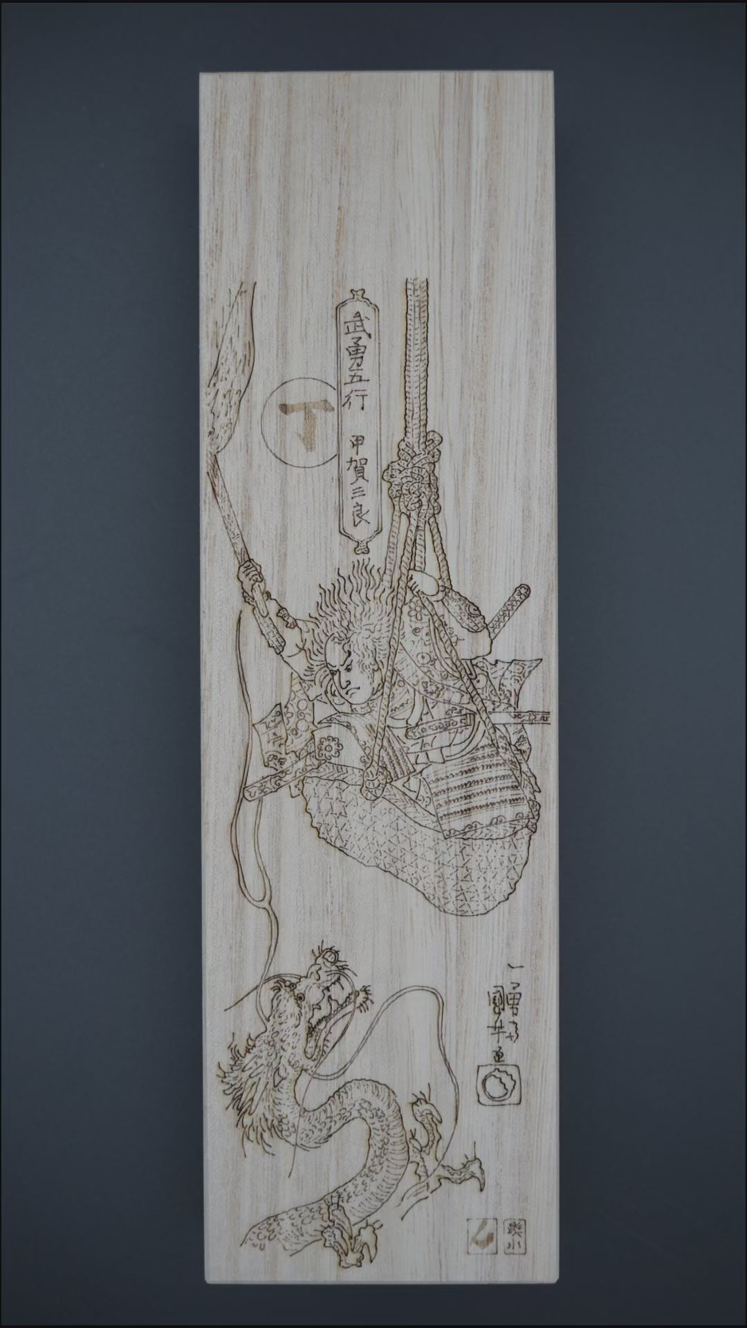 Engraved on the lid is an Ukiyo-e woodblock print of Utagawa Kuniyoshi's "Koga Saburo Suspendeding Basket Watching Dragon"This work represents Heian-period 794-1185 warrior Koga Saburo, he is compared to the fourth zodiacal sign hinoto and the element of fire. Koga Saburo is a famous figure in Japanese folklore.