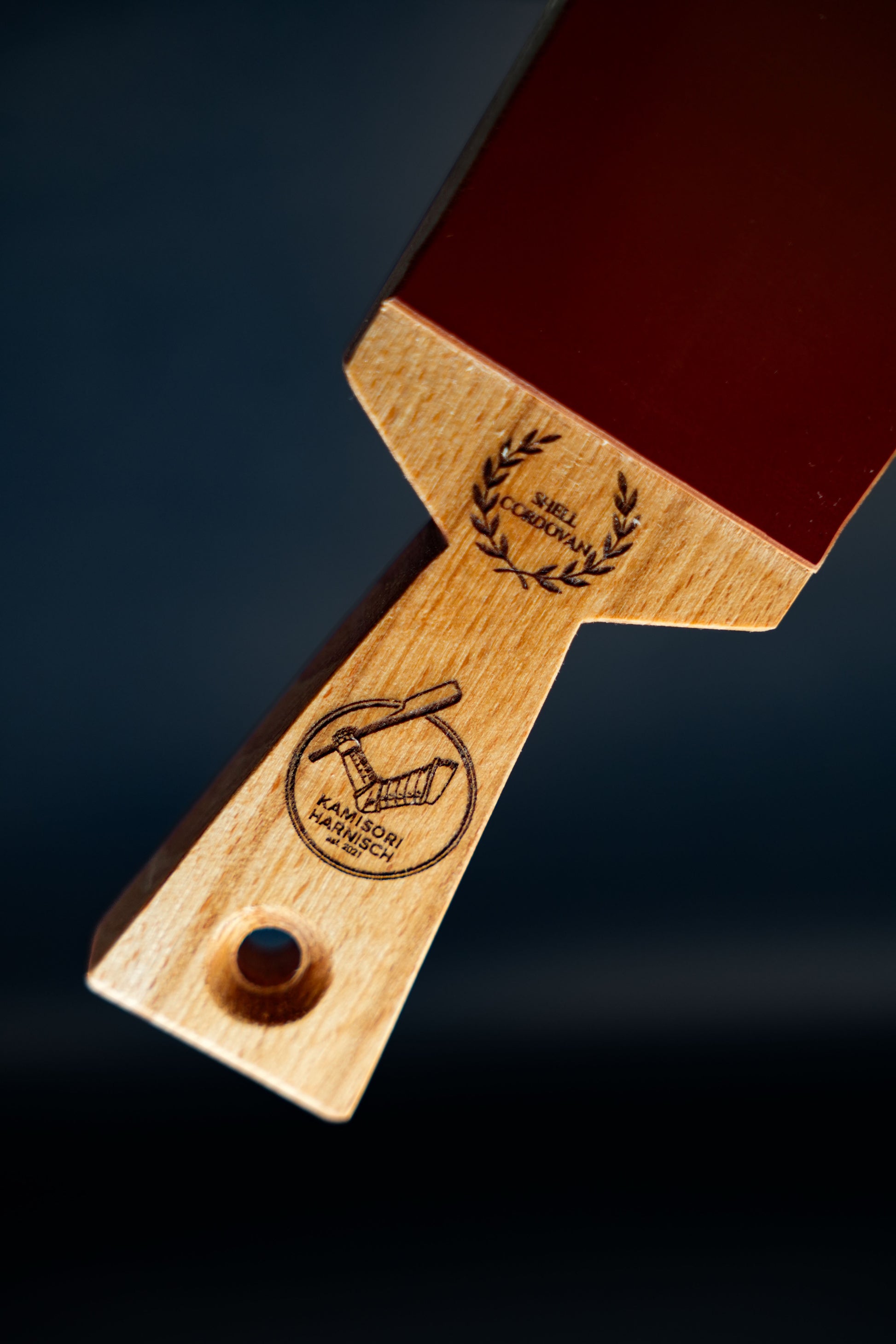 Fabriqué avec précision et soin, notre cuir à rasoir est fabriqué à la main en Allemagne à l'aide d'outils japonais traditionnels. Il est doté d'une base en hêtre robuste et d'une épaisse couche de cuir Shell Cordovan (cheval) italien. Le bois de hêtre est recouvert d'une cire Saflor entièrement naturelle pour une touche d'authenticité parfaite.