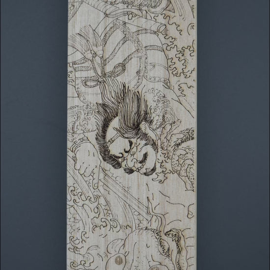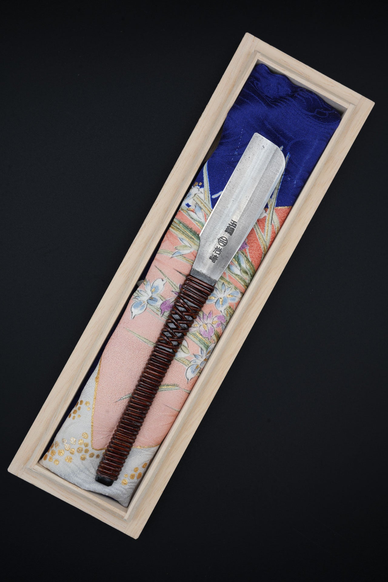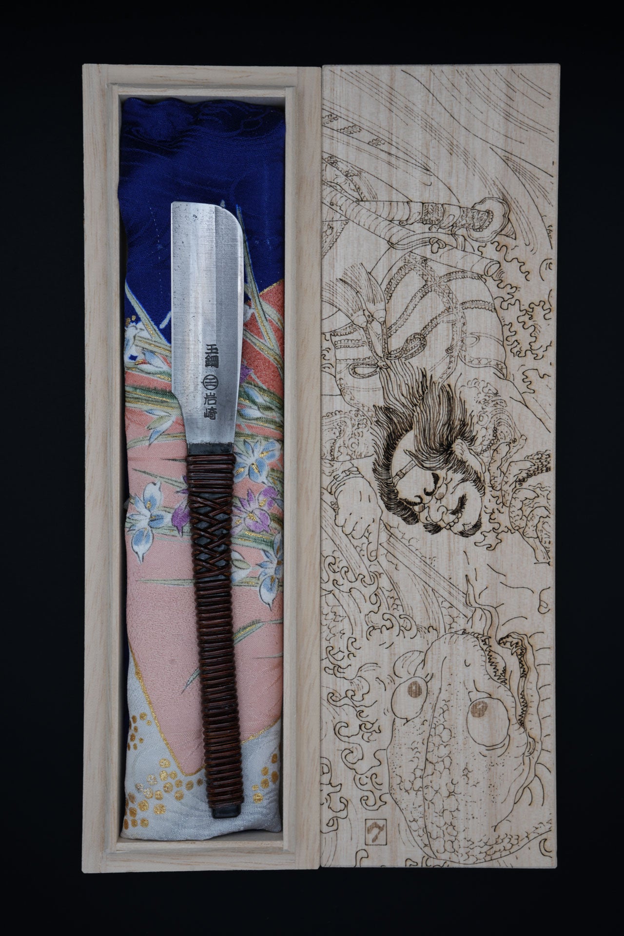 La lame est enveloppée dans un morceau de soie japonaise recyclée, cousu à la main à partir d'un vieux kimono. Elle est conditionnée dans un coffret en bois de paulownia, fabriqué au Japon et gravé au laser.