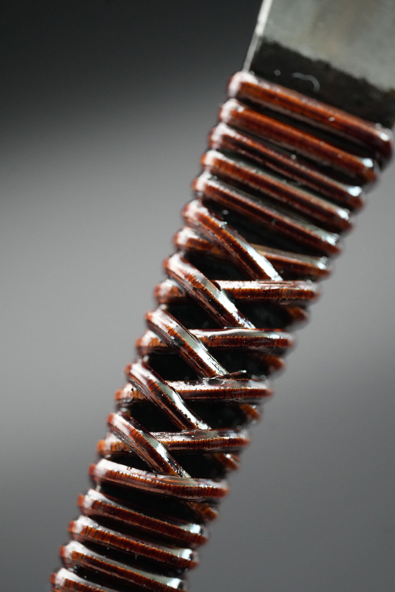 On l'a ensuite laqué avec de la laque urushi, puis enveloppé de rotin japonais et laqué à nouveau avec trois couches d'urushi.