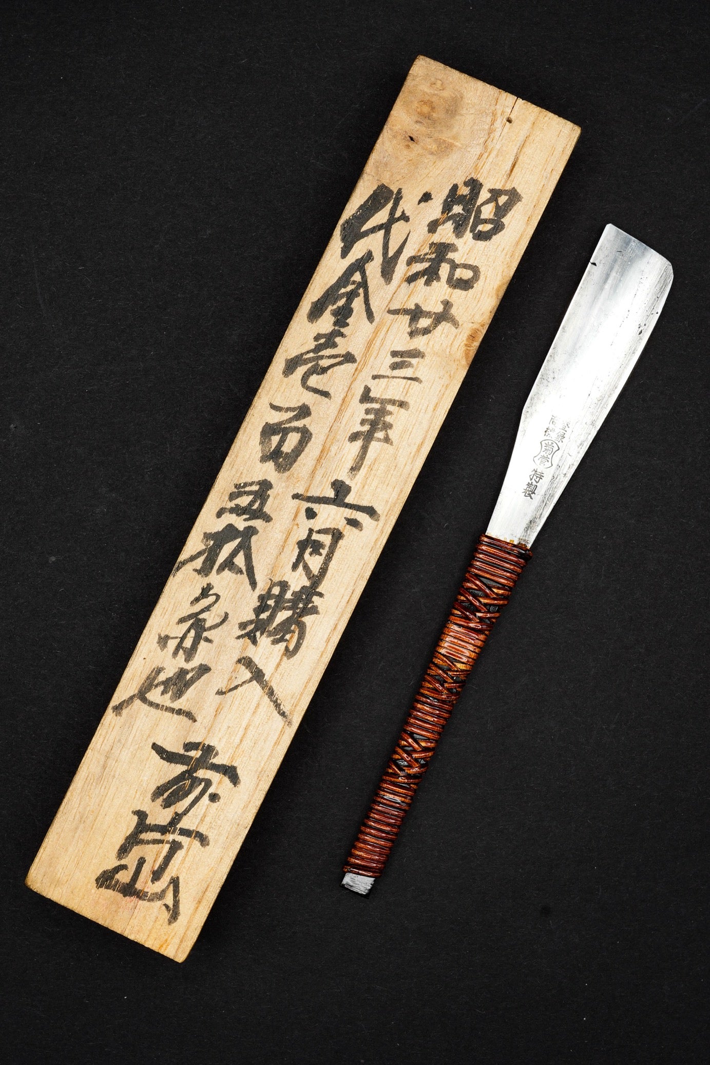 Un rasoir droit japonais (kamisori) vintage du début de l'ère Showa, fabriqué par Kikuei (菊營), avec sa boîte d'origine indiquant sa date d'achat : Showa 3, soit 1928. La présence de cette date est extrêmement rare, ce qui en fait une pièce de collection.