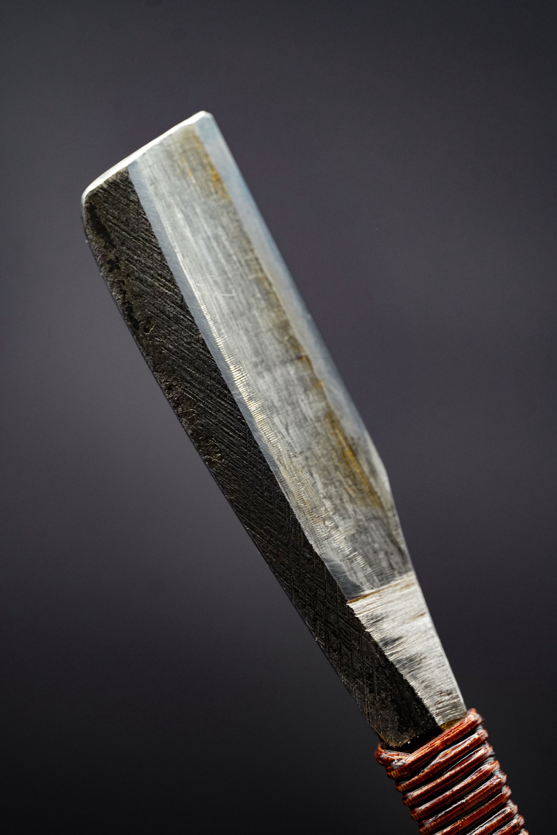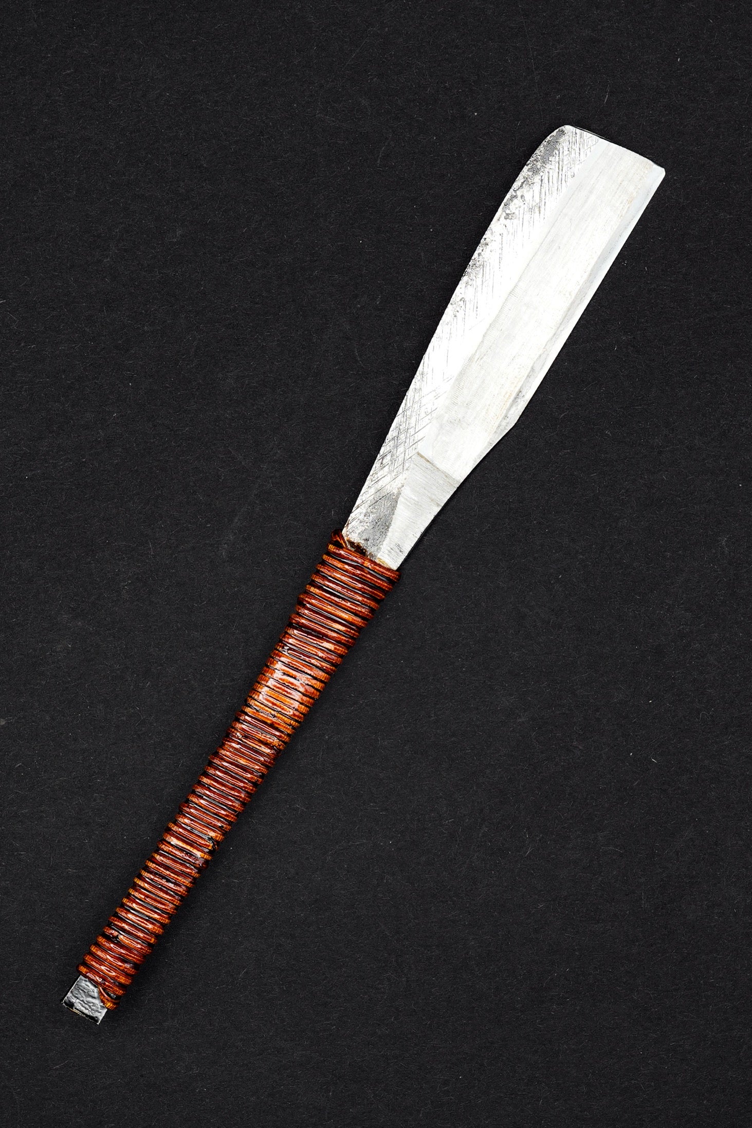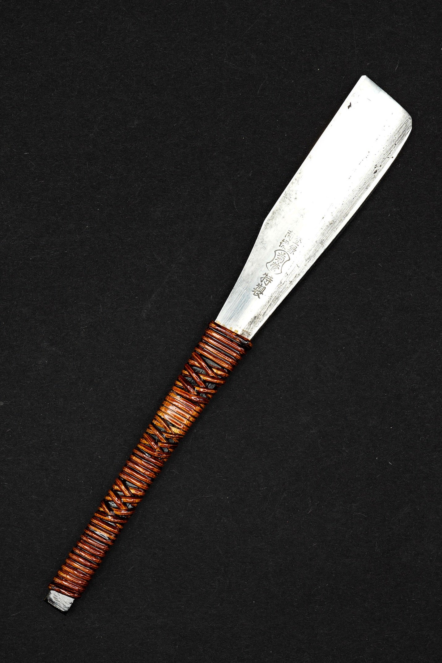 Nous avons retiré l'ancienne poignée, les taches et la rouille. Nous l'avons ensuite bleuie pour éviter qu'elle ne rouille davantage. Nous avons ensuite fixé une poignée en rotin traditionnelle recouverte de laque urushi japonaise naturelle.