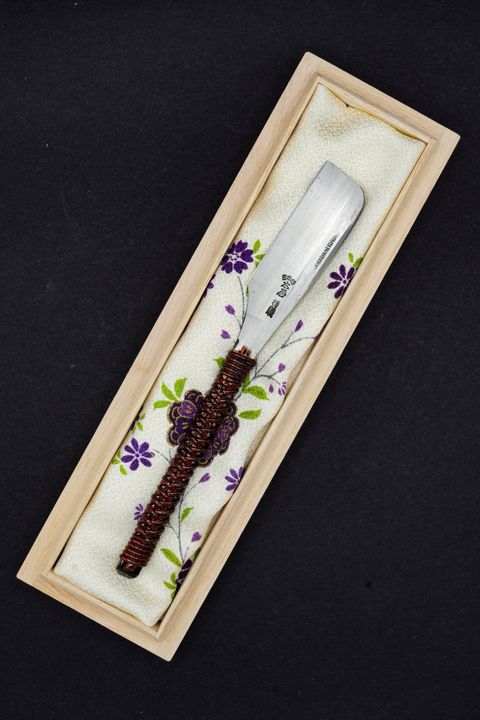 La lame est enveloppée dans une pièce vintage recyclée d'un kimono en soie japonais.