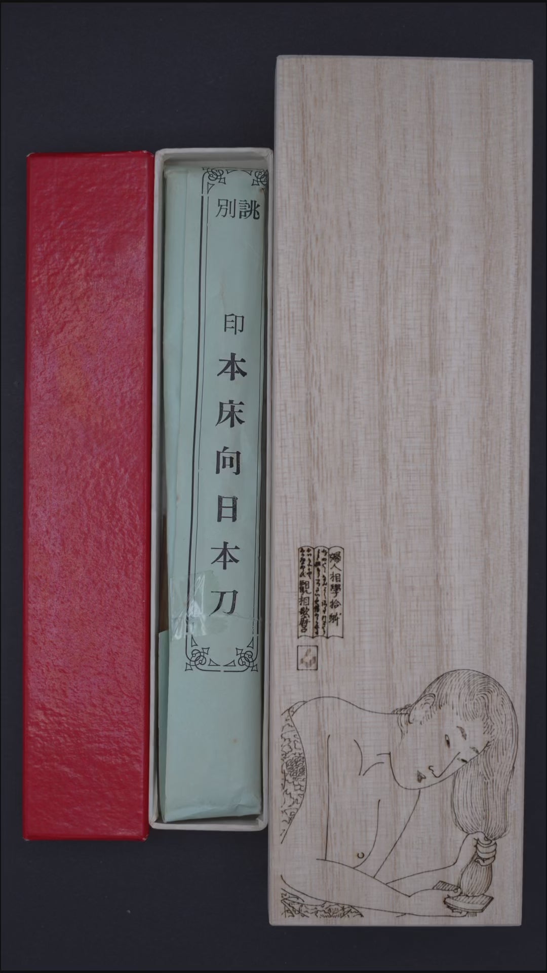 Engraved on the lid is an Ukiyo-e woodblock print of Utamaro Kitagawas's "Woman Combing her Hair" of the series Ten Types in the Physiognomic Study of Women (婦人相學十躰)
