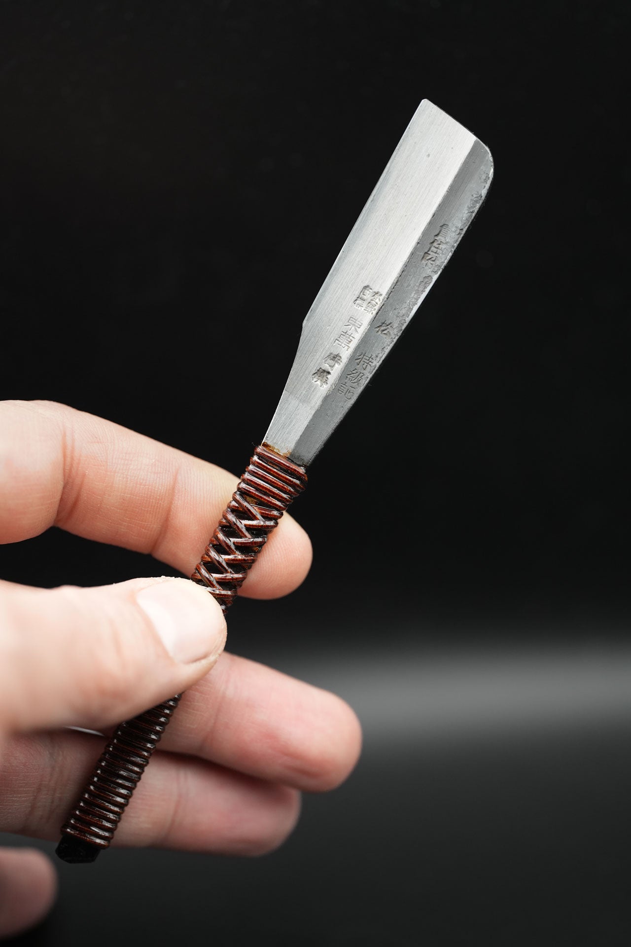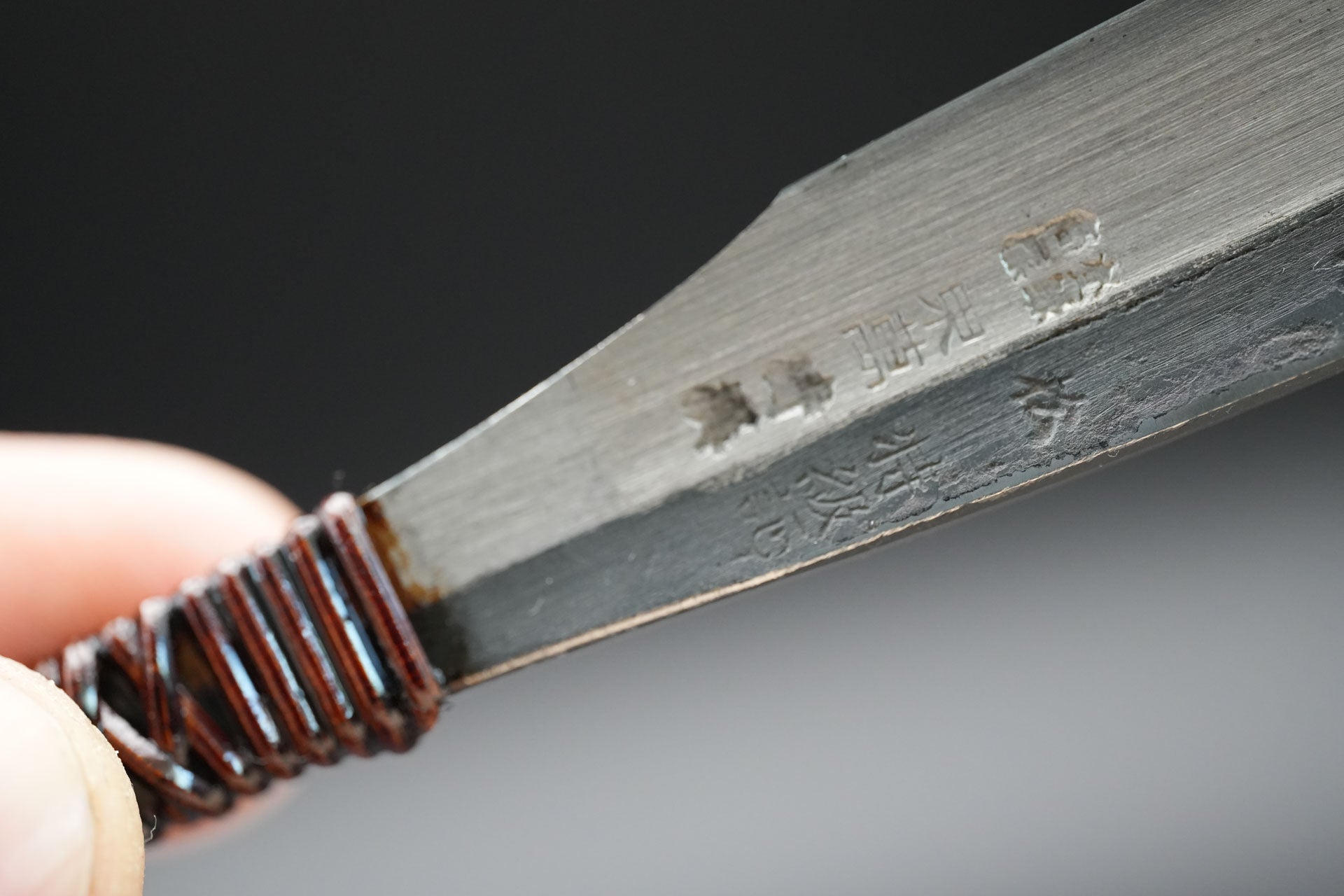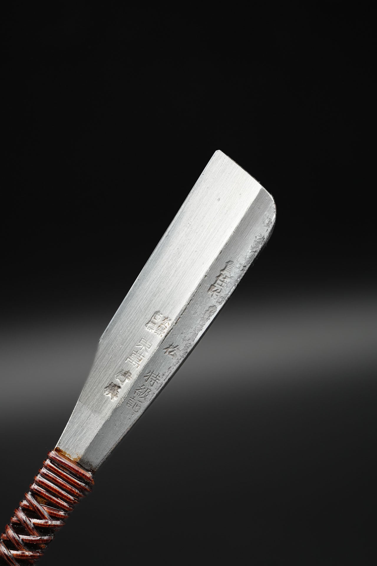Nous avons retiré l'ancienne poignée et les anciennes taches. Puis nous l'avons bleuie pour la protéger de la rouille. Enfin, nous y avons fixé un revêtement traditionnel en rotin recouvert de laque urushi japonaise naturelle.