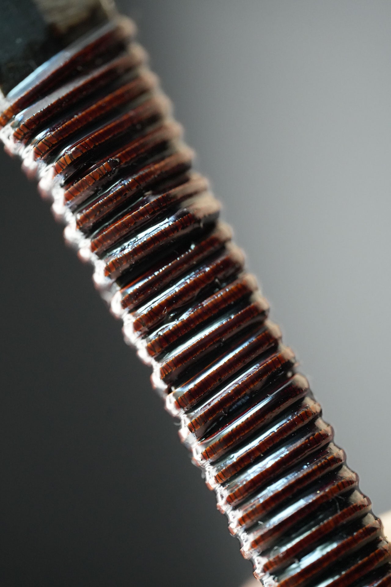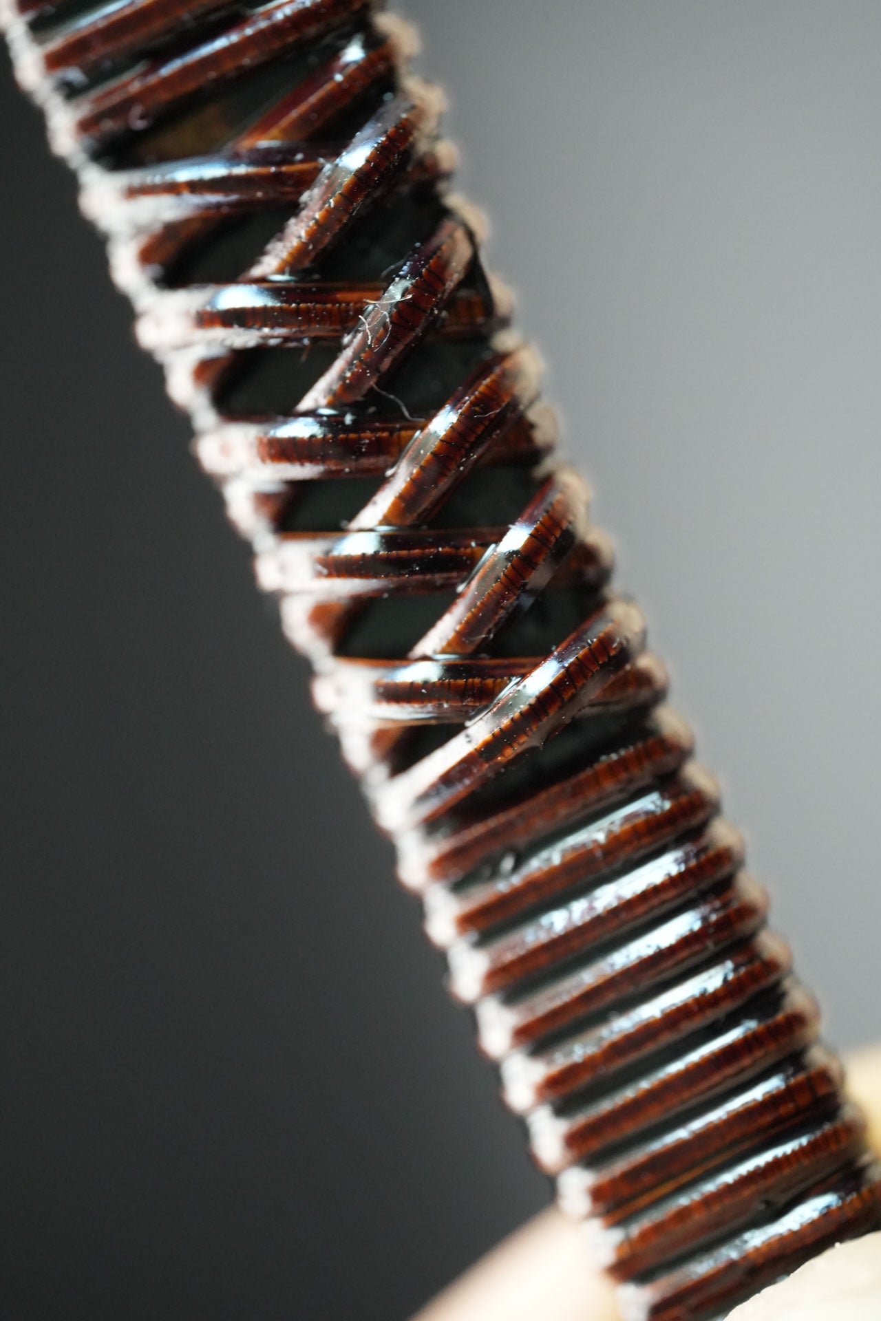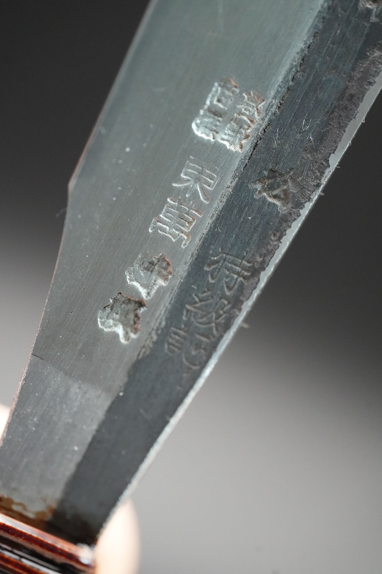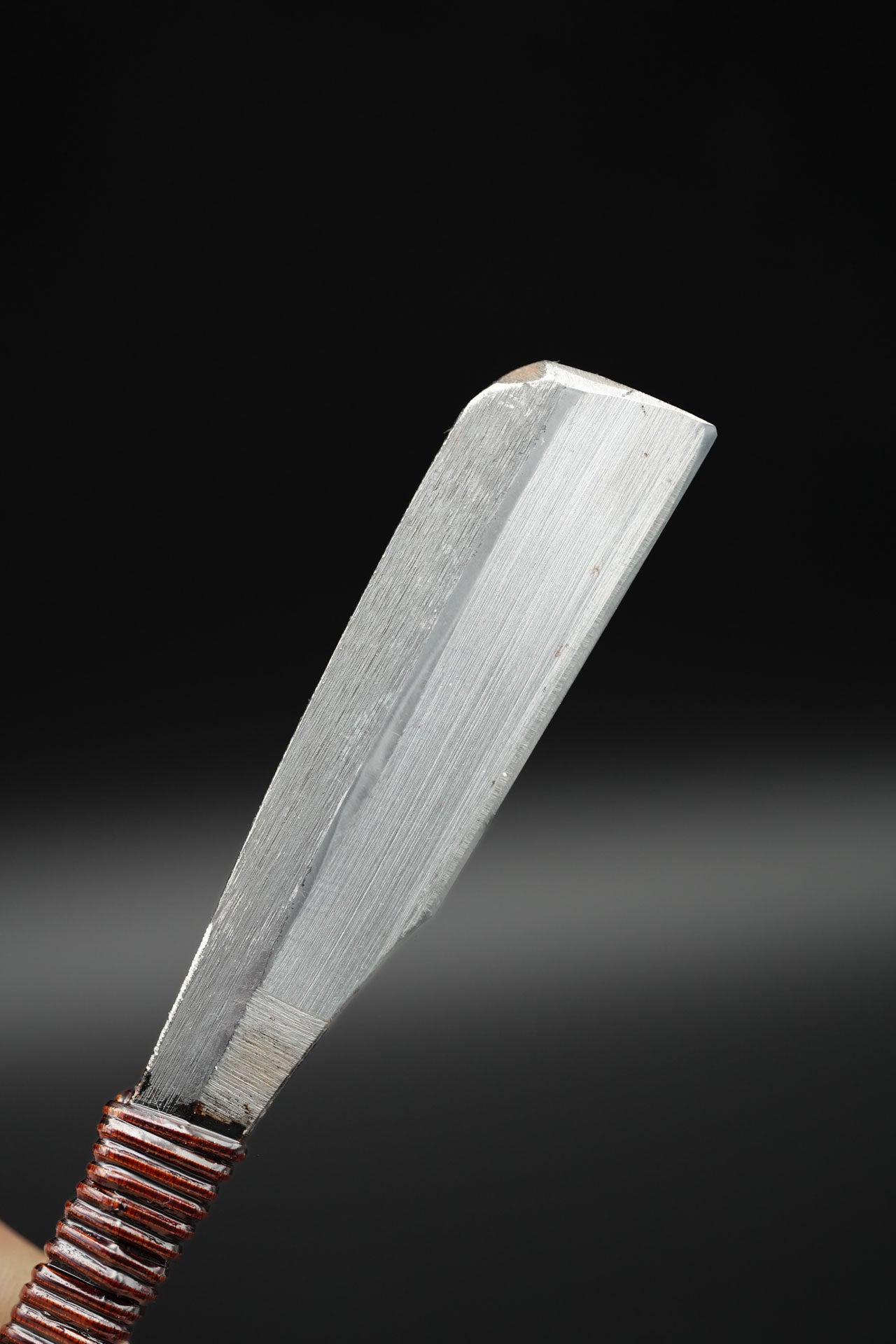 Nous avons retiré l'ancienne poignée et les anciennes taches. Puis nous l'avons bleuie pour la protéger de la rouille. Enfin, nous y avons fixé un revêtement traditionnel en rotin recouvert de laque urushi japonaise naturelle.