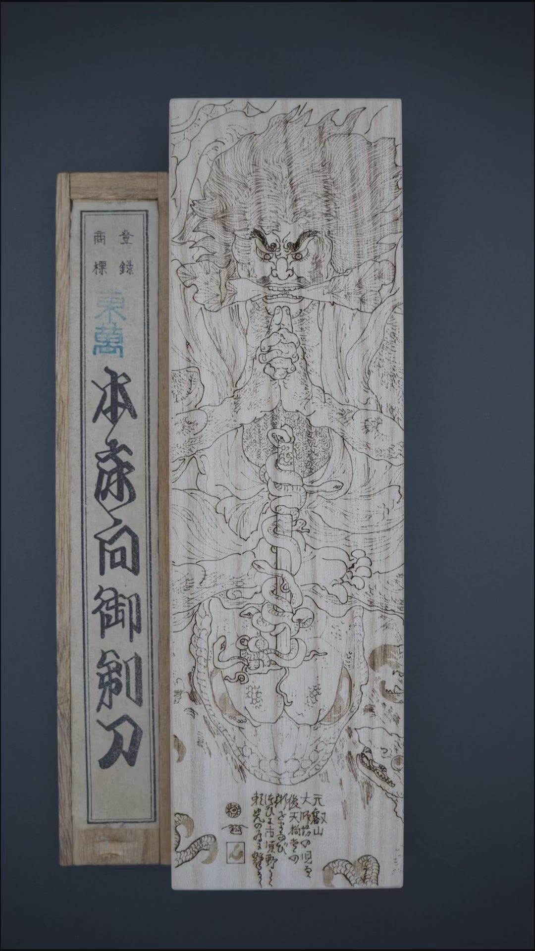 Engraved on the lid is an Ukiyo-e woodblock print of Kuniyoshi`s - "Kidomaru" from around 1840.