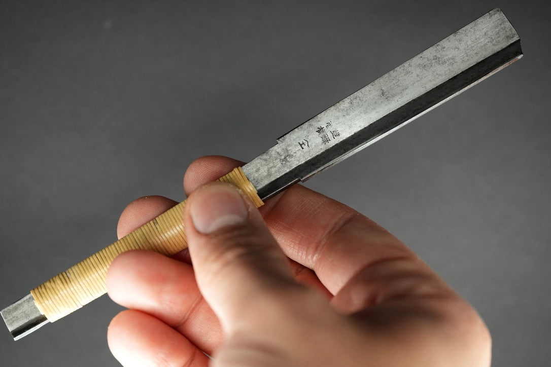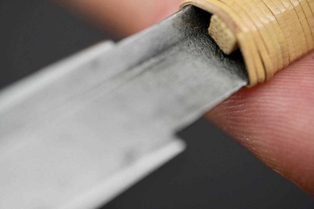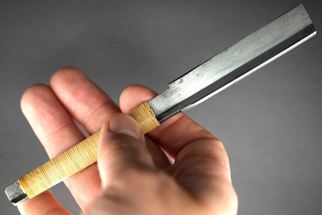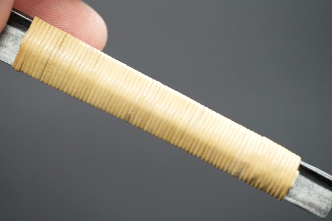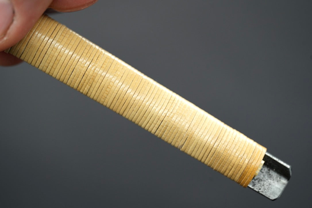 Après le bleuissage, nous avons fixé un emballage de manche en rotin en utilisant une technique d'emballage traditionnelle pour les rasoirs japonais.