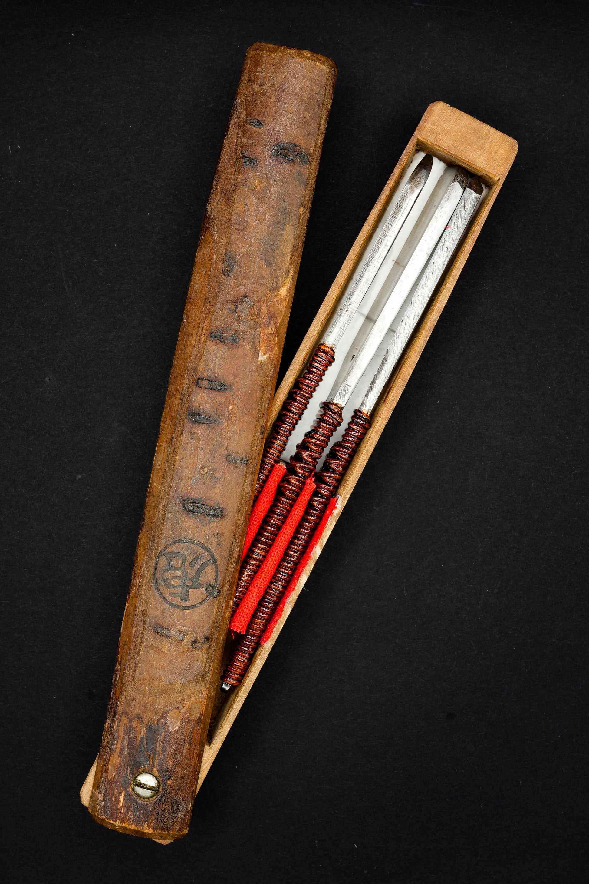 Nous avons restauré les deux, la boîte et le Kamisoris, et ajouté de nouveaux revêtements de poignée en rotin et laque Urushi.