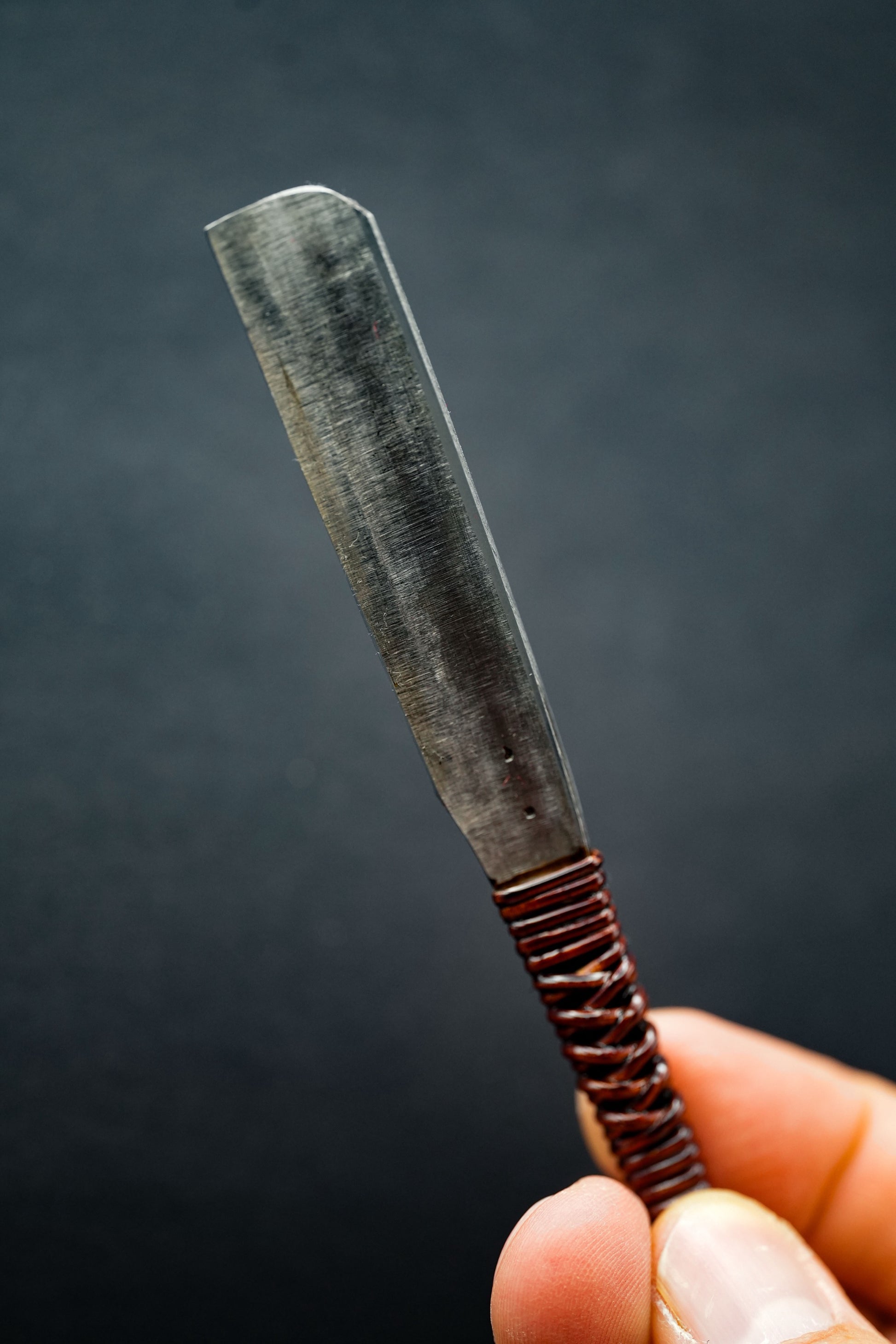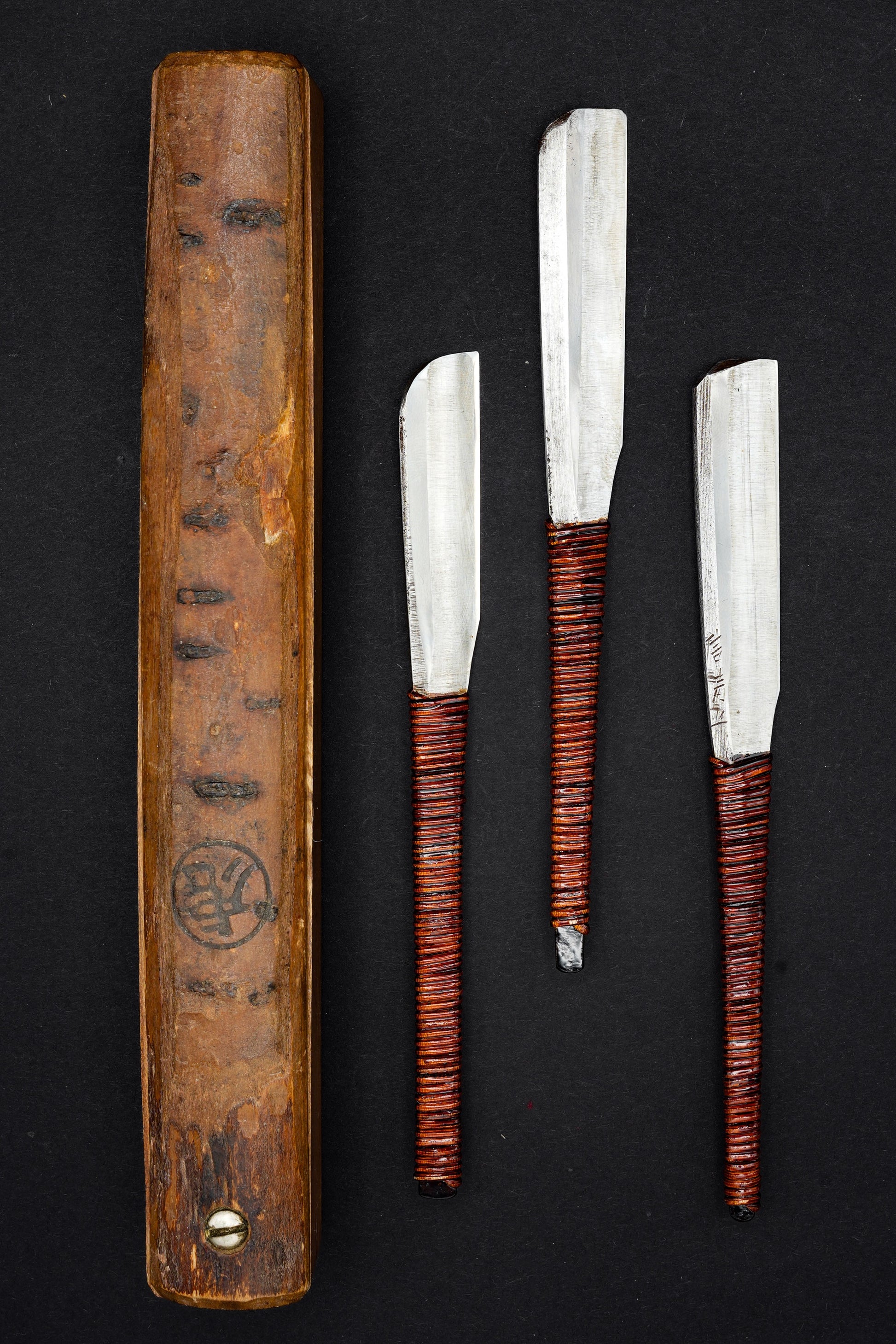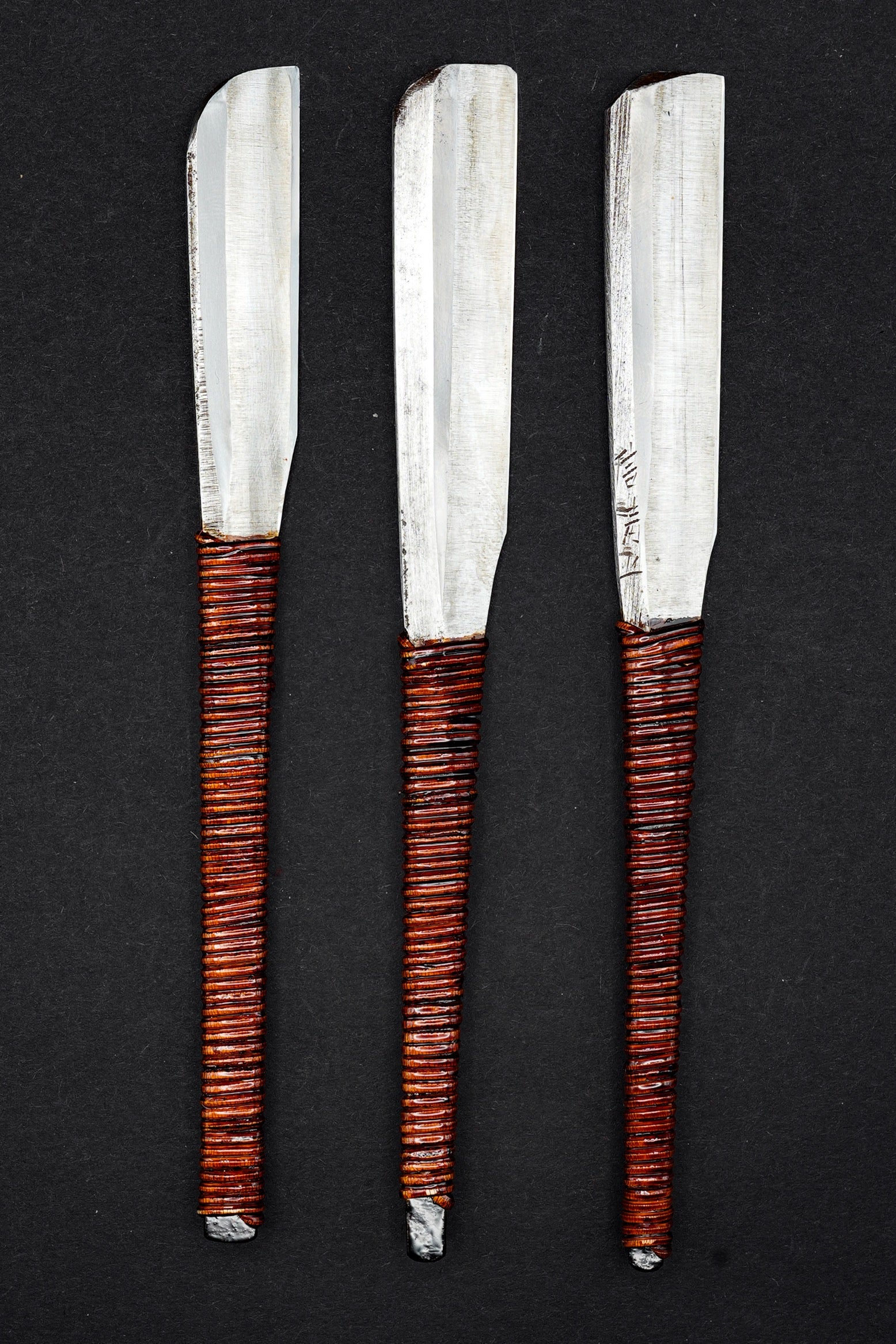 Similaires aux sabres de samouraï traditionnels, ces kamisori étaient forgés à la main à partir de deux couches : la partie tranchante était en acier à haute teneur en carbone et la couche de support en fer.