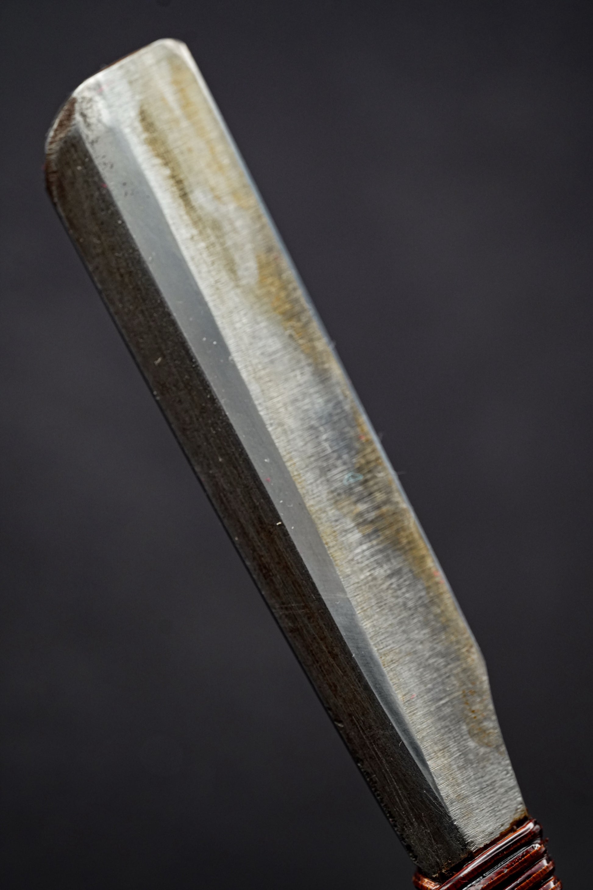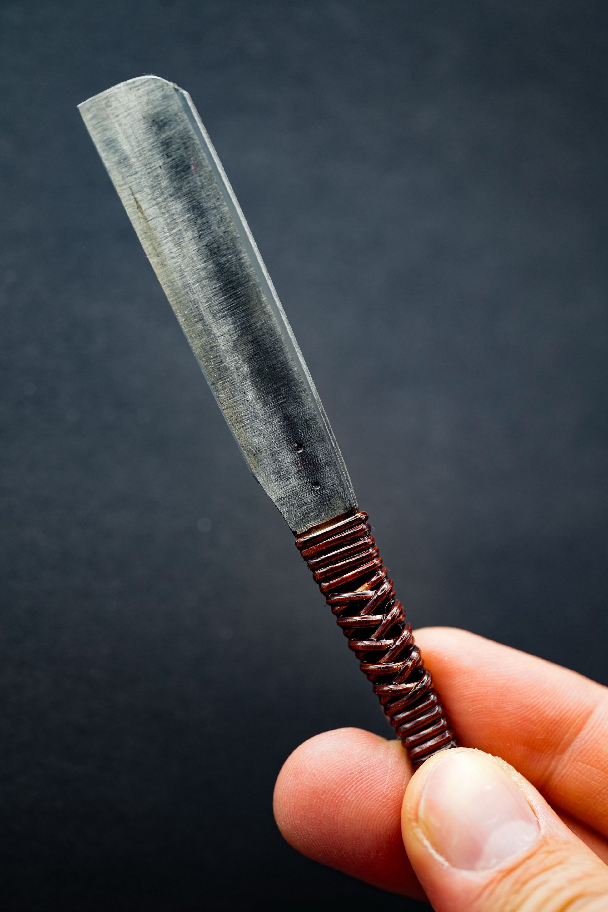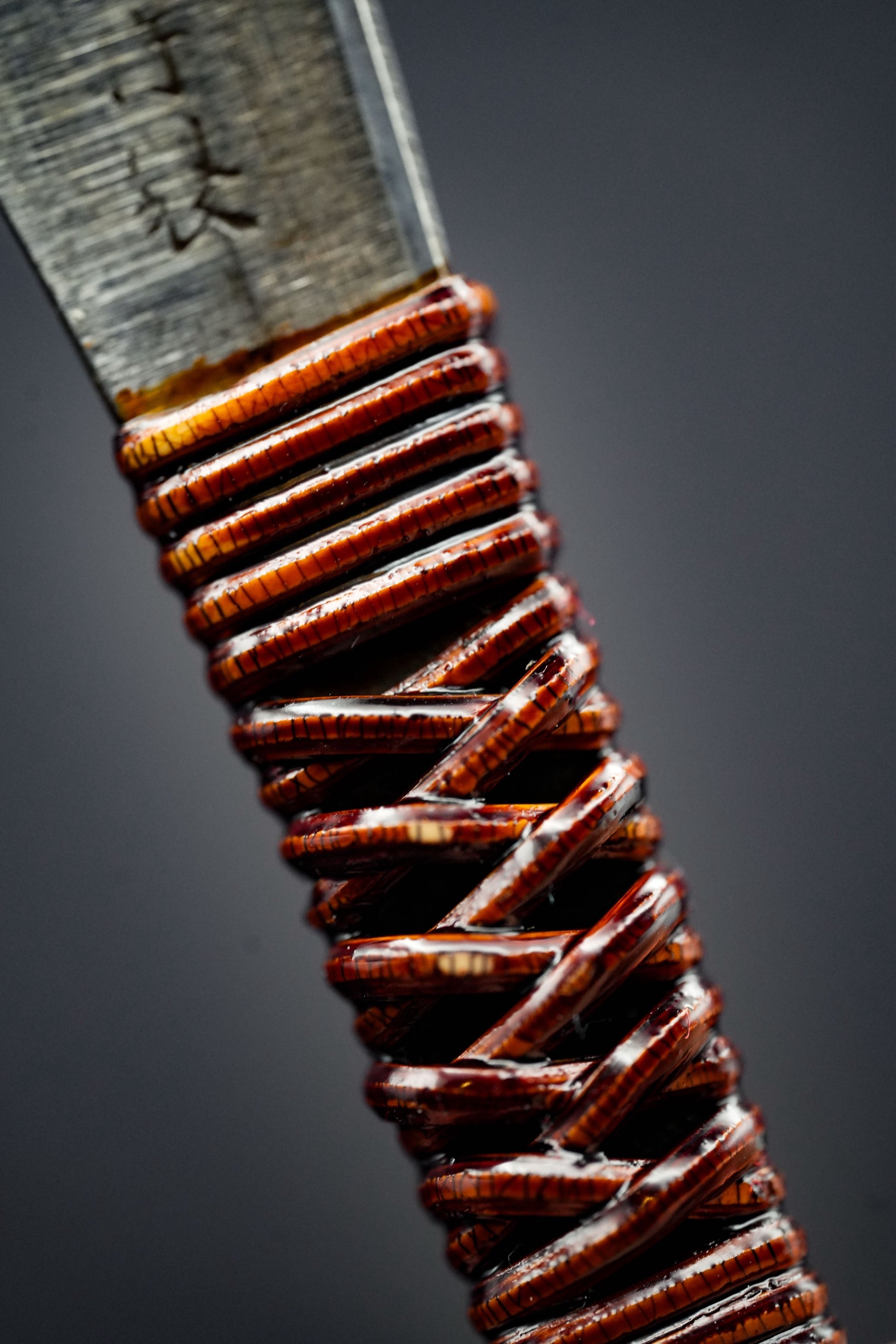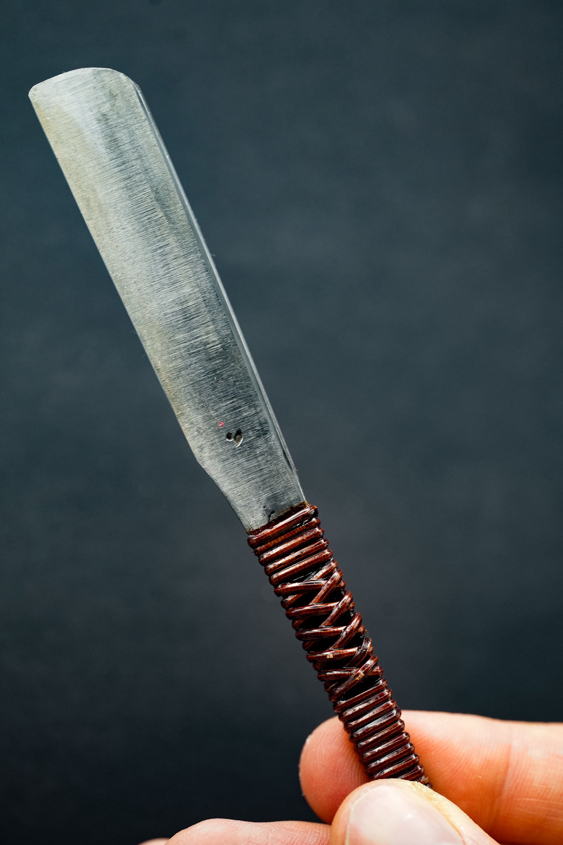Nous avons retiré l'ancienne poignée, les taches et la rouille. Puis, nous l'avons bleuie pour la protéger de la corrosion. Enfin, nous avons fixé une poignée traditionnelle en rotin recouverte de laque urushi japonaise naturelle.