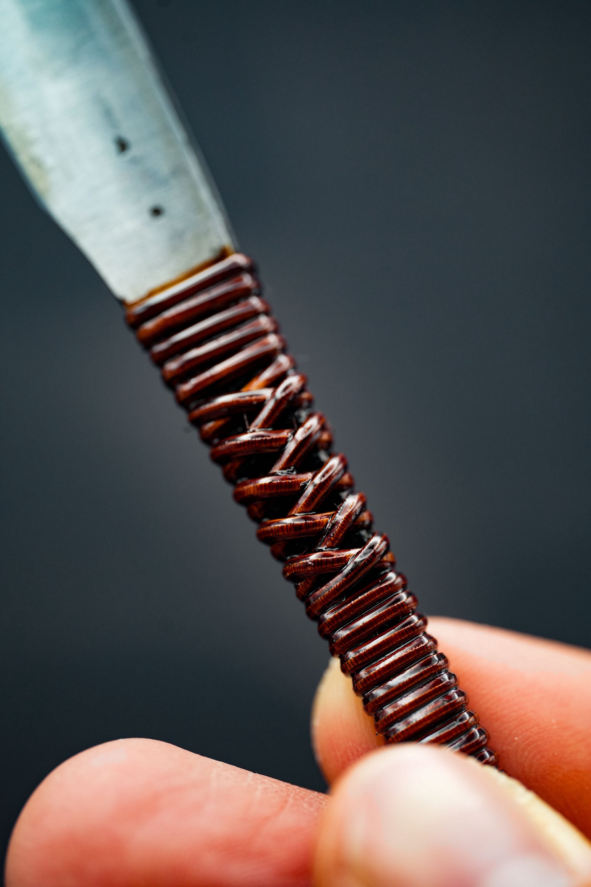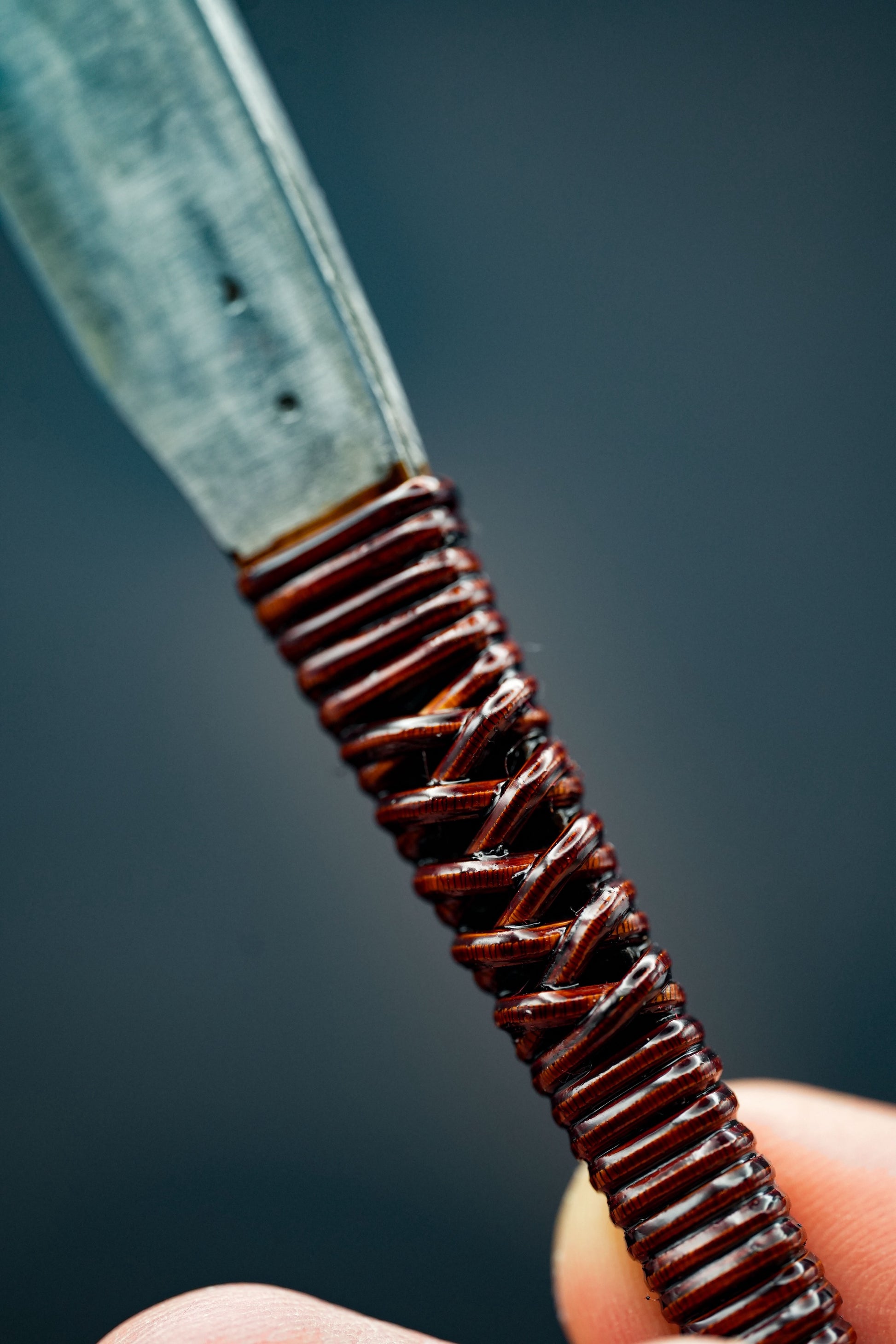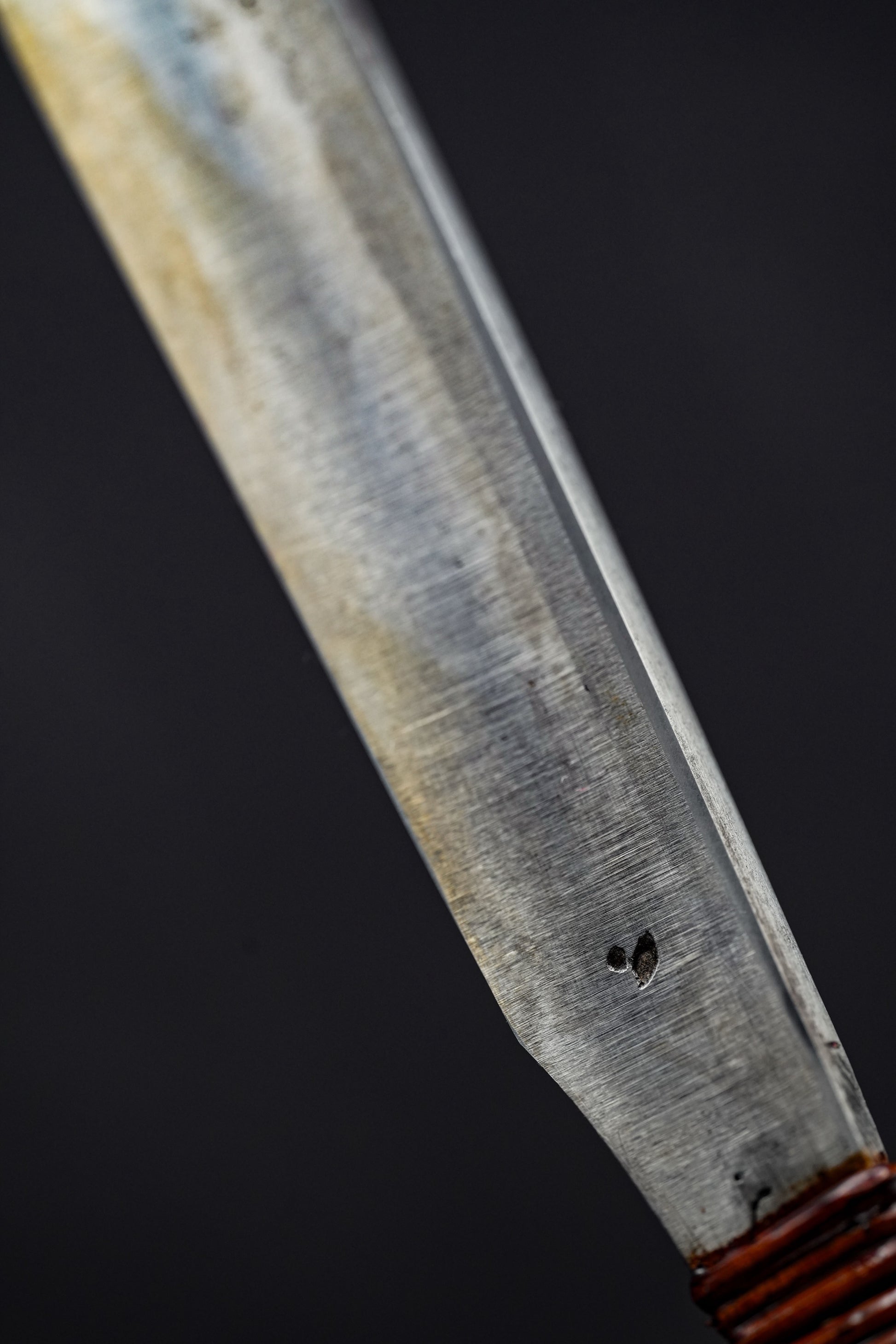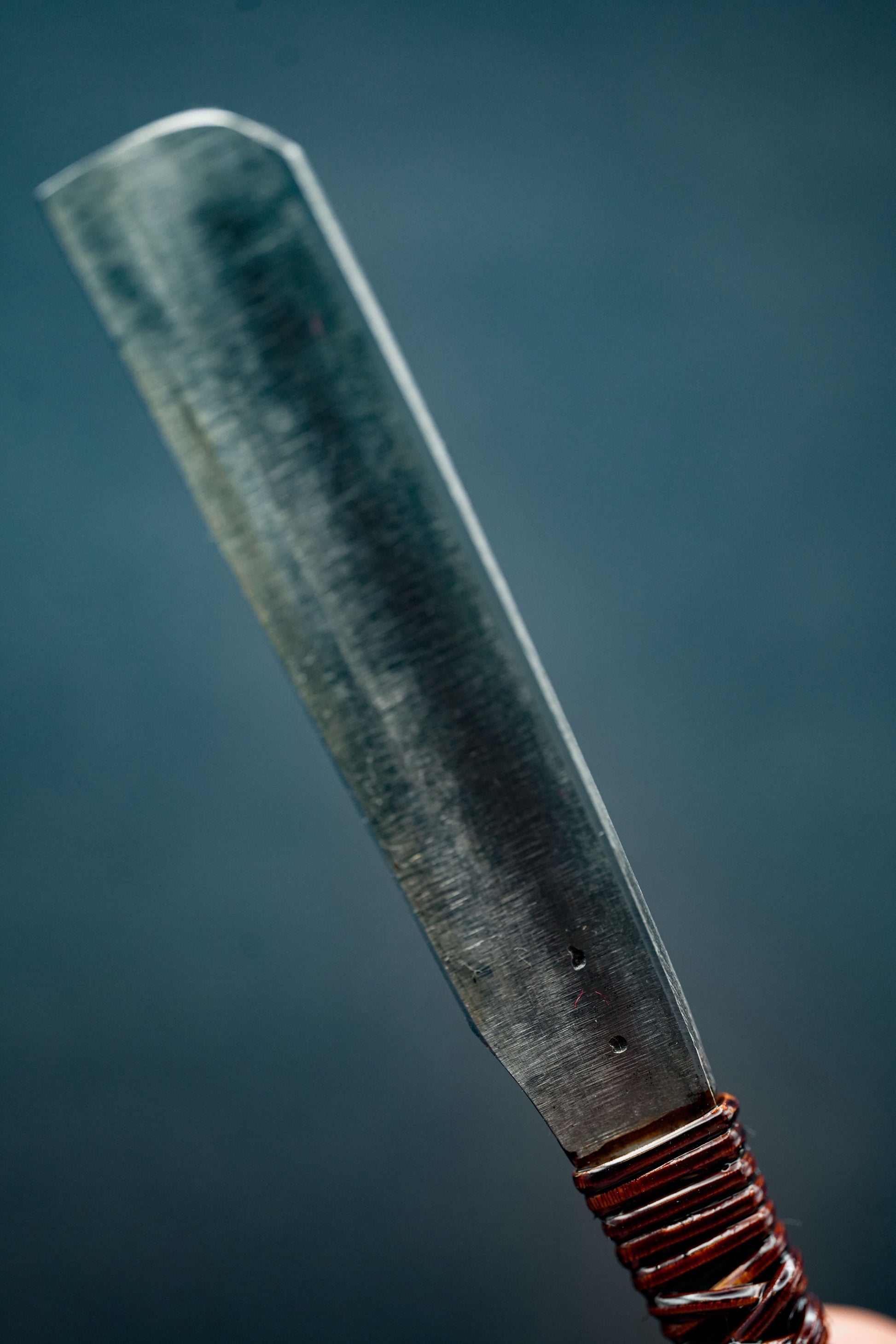Nous avons retiré l'ancienne poignée, les taches et la rouille. Puis, nous l'avons bleuie pour la protéger de la corrosion. Enfin, nous avons fixé une poignée traditionnelle en rotin recouverte de laque urushi japonaise naturelle.