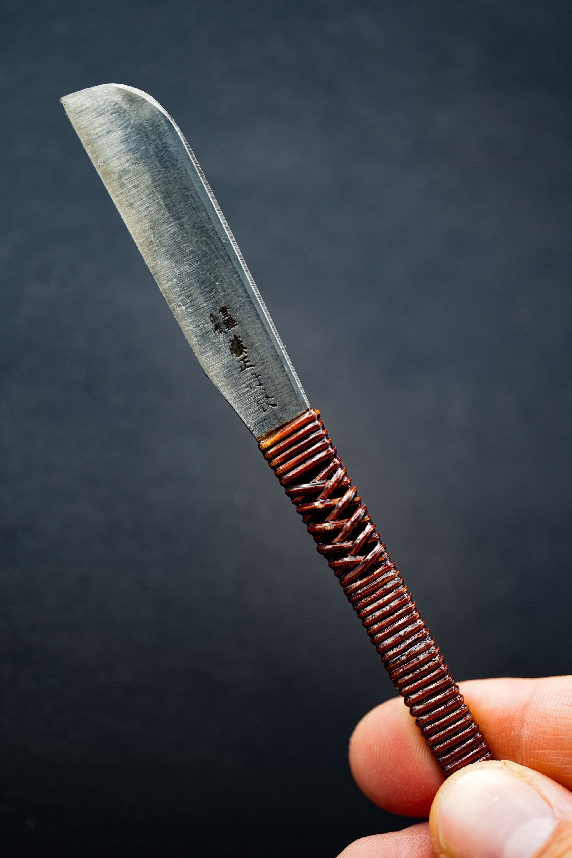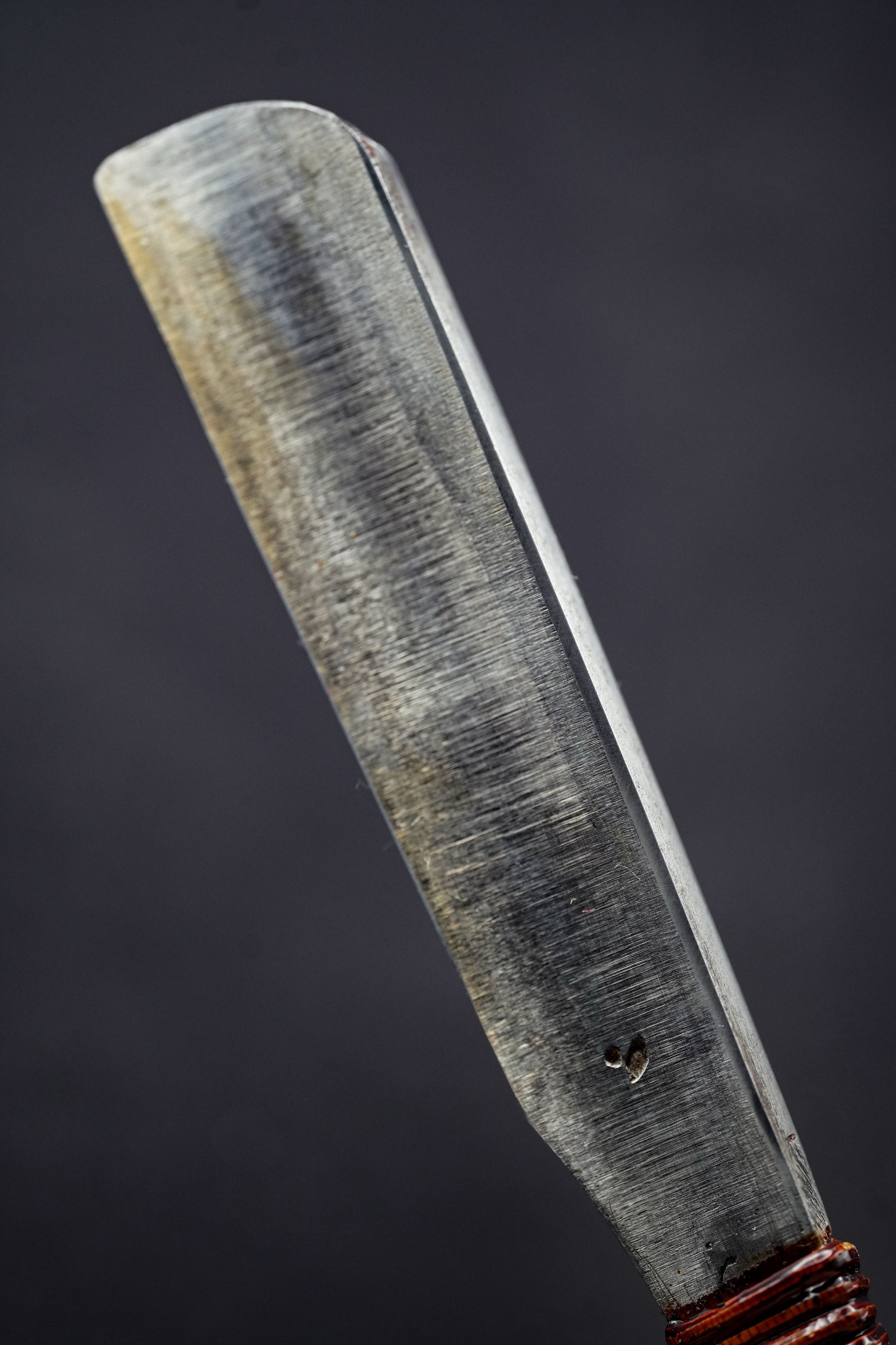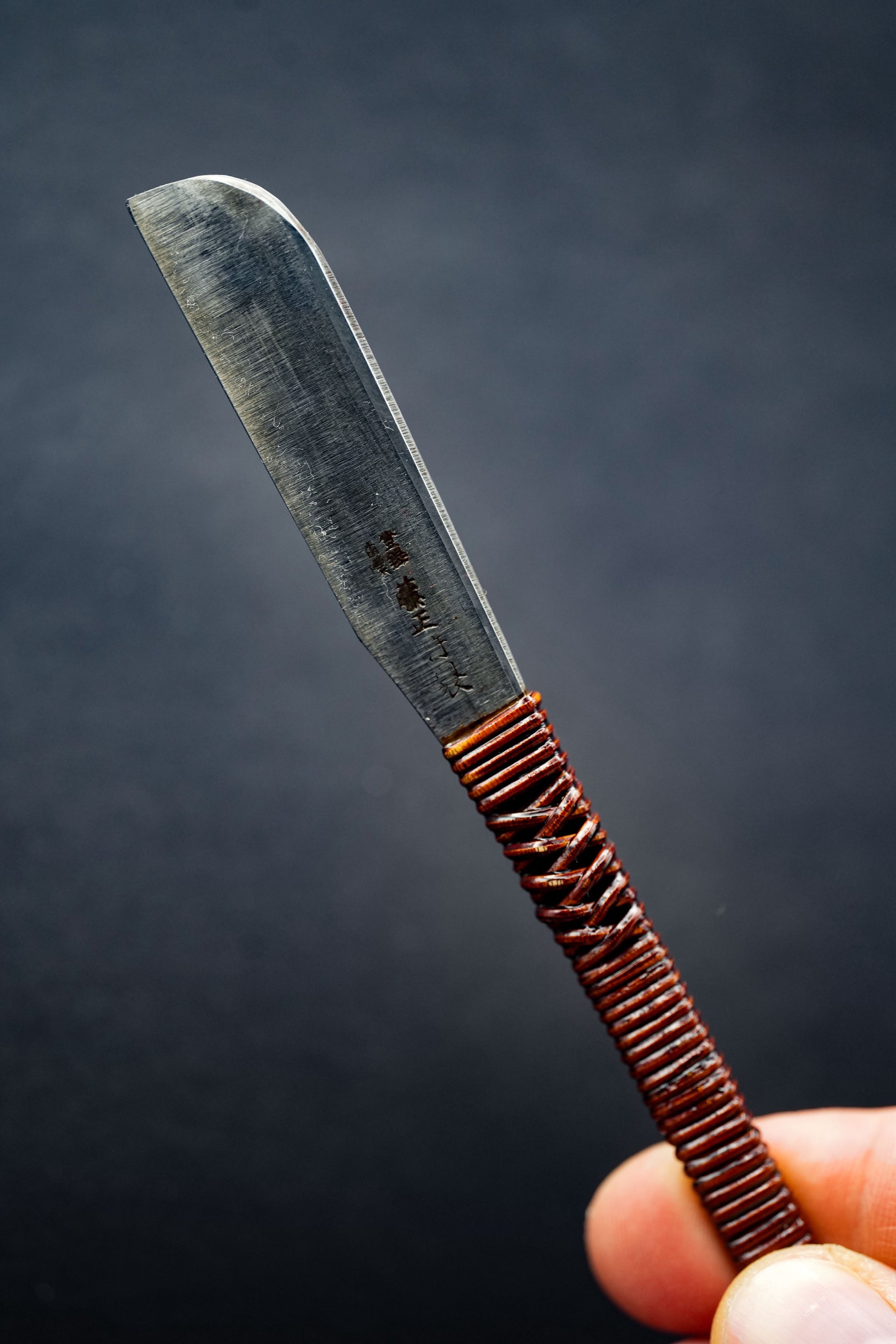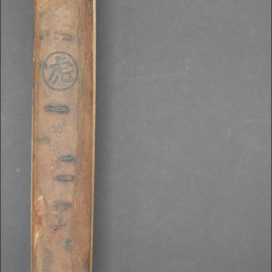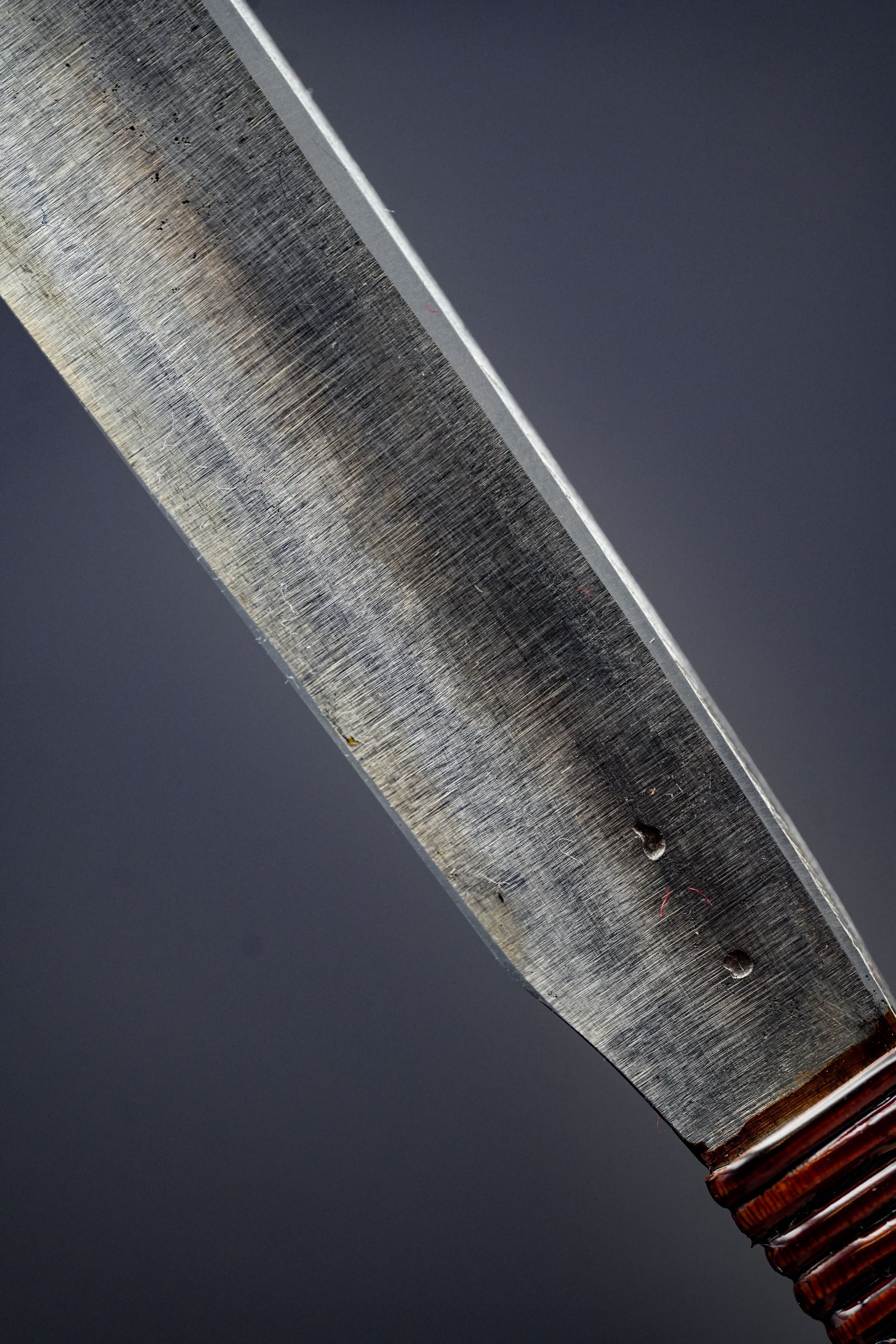 Nous avons retiré l'ancienne poignée, les taches et la rouille. Puis, nous l'avons bleuie pour la protéger de la corrosion. Enfin, nous avons fixé une poignée traditionnelle en rotin recouverte de laque urushi japonaise naturelle.