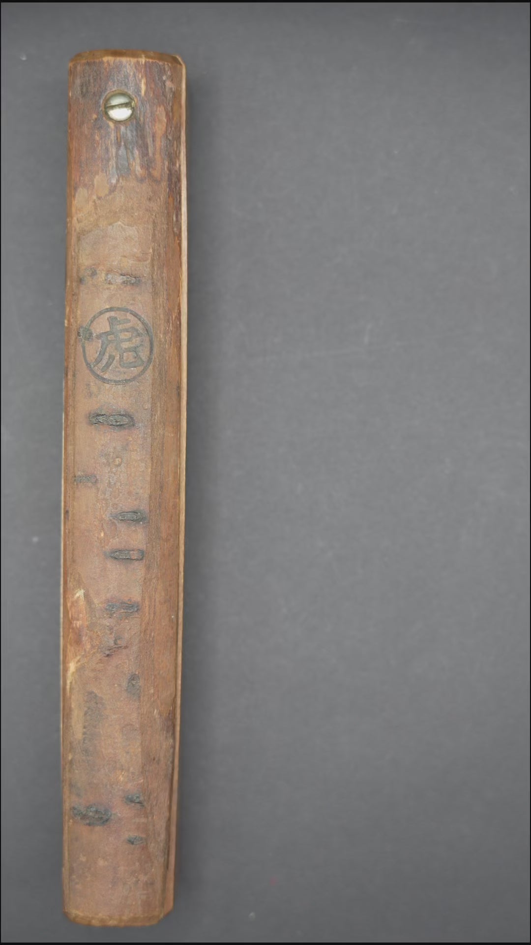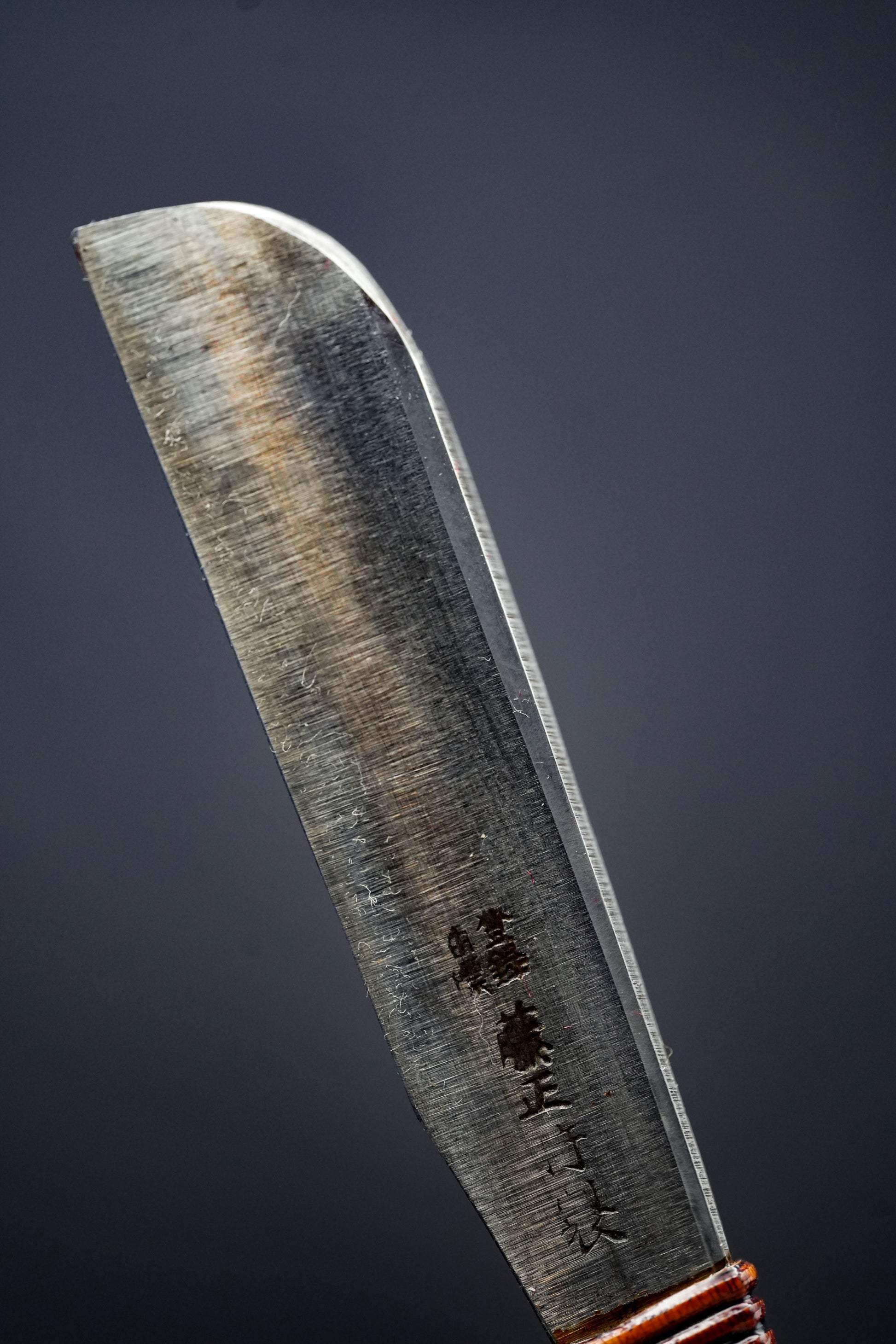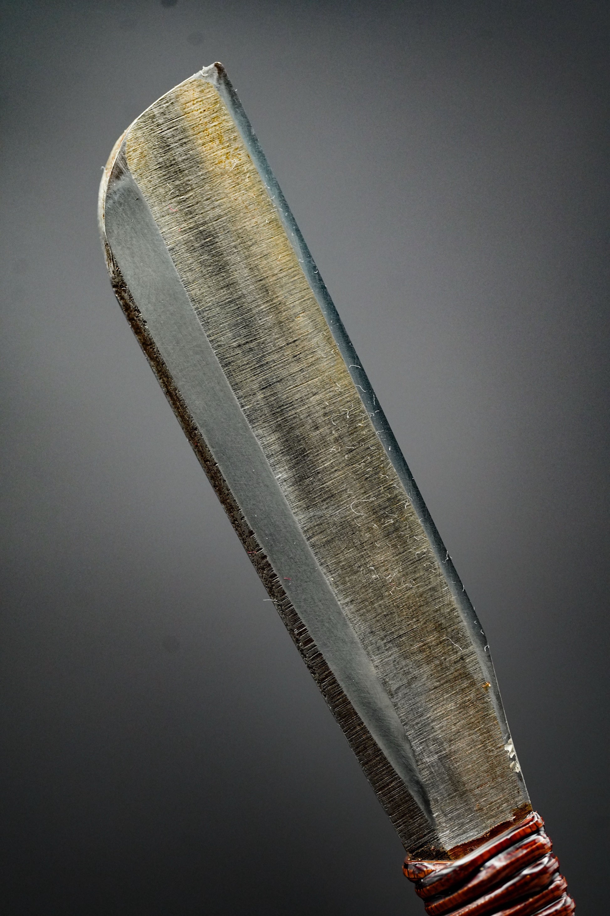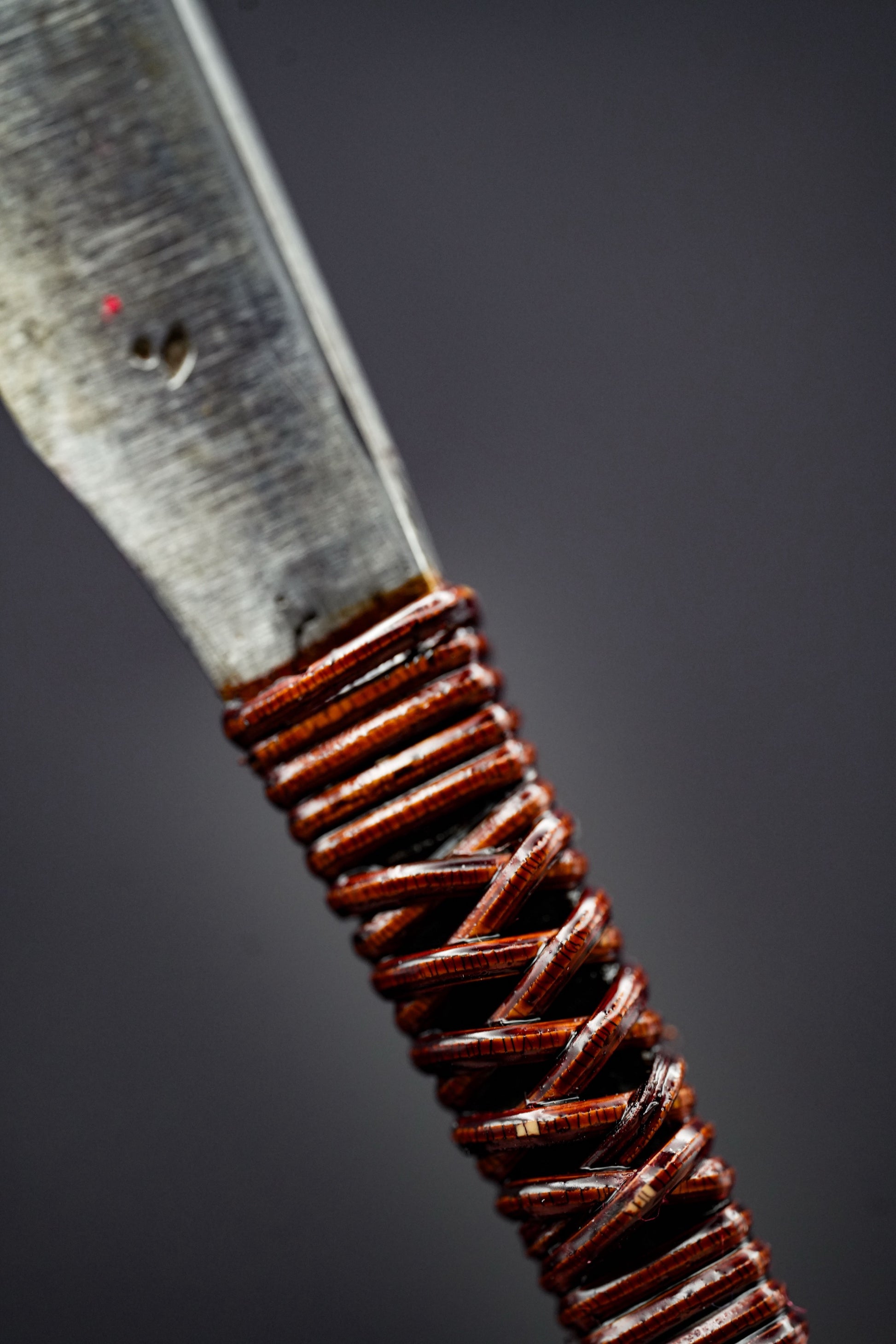 Nous avons retiré l'ancienne poignée, les taches et la rouille. Puis, nous l'avons bleuie pour la protéger de la corrosion. Enfin, nous avons fixé une poignée traditionnelle en rotin recouverte de laque urushi japonaise naturelle.