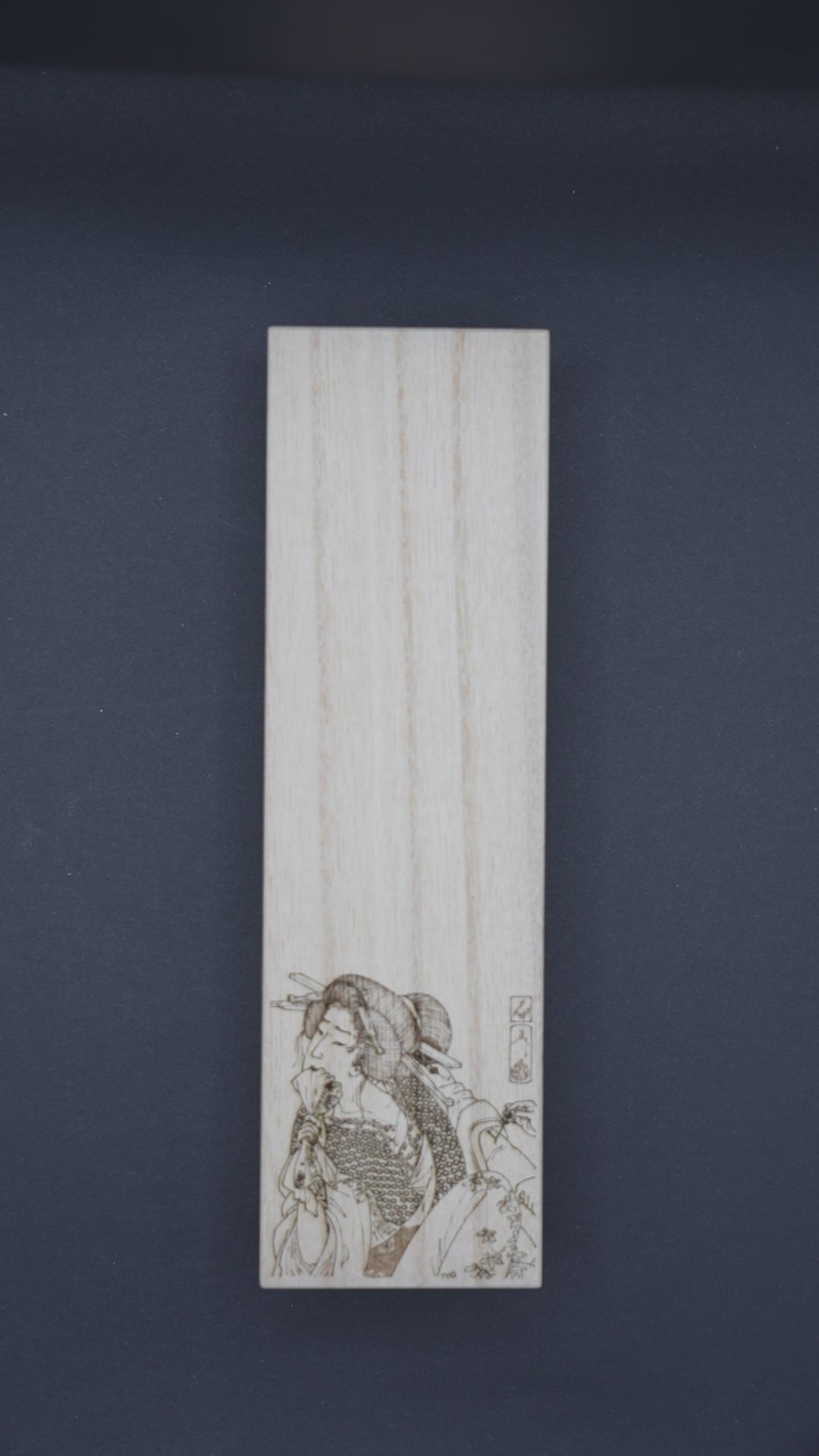 Engraved on the lid is an Ukiyo-e woodblock print of Tsukioka Yoshitoshi`s "Suffering from pain courtesan of the period" out of the series "32 feminine faces of everyday life" from 1888. The print shows an Geisha with the highest of ranks "Oiran" getting a tattoo. It was common that Geishas got the names of their highest valued customers as a secret tattoo.